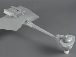 The K't'inga miniature was modified for "Star Trek: The Undiscovered Country". Innumerable tiny pieces of etched metal were added to the model. In the January 1992 issue of American Cinematographer, Bill George stated that the team "came up with the concept that when these ships return victorious from battle, the Klingons build some sort of epaulet onto their wings or paint a new stripe on". So this was intended to distinguish the Qo'noS Wa' ("Kronos One"), as Chancellor Gorkon's flagship, from less decorated K't'ingas. On the other hand, the modifications are hardly visible on screen, so we may claim that all K't'ingas always looked like this. It may still be an option that there are many very slight variations of the class, which may or may not help justify an extended life span.There is, however, one more obvious difference: the plasma in the nacelles of the Qo'noS Wa' from "Star Trek VI" shines cyan inside and outside, where there is no shine in TMP. On the other hand, Miranda-class ships suddenly have glowing nacelles since DS9 too. It seems to be much a matter of preference whether the Gorkon's flagship is essentially the same as every other K't'inga, or rather a variant. We actually don't know how the plasma flow in Klingon ships is controlled. It is possible that, unlike it seems to be on Federation ships, the nacelles are not lighted all the time.