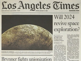 Q reads an issue of the Los Angeles Times at the end of PIC: "Watcher". The paper is dated Sunday, January 21, 2024 (about three months ahead of La Sirena's arrival to the past). The main headline "Will 2024 revive space exploration?" is about the upcoming Europa mission. We can also see an article titled "Brynner fights unionization", obviously referring to Christopher Brynner (DS9: "Past Tense").