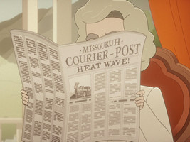 We can see an issue on the "Missouruh Courier-Post" (Southern spelling!) in Boimler's "Twaining" scenario. The only legible part is the headline "Heat Wave".