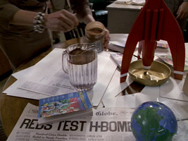 The front page of the New York Globe with the headline "Reds Test H-Bomb" can be seen in the illusory scenario of this episode, but it is not close enough to identify any paragraph text in SD.