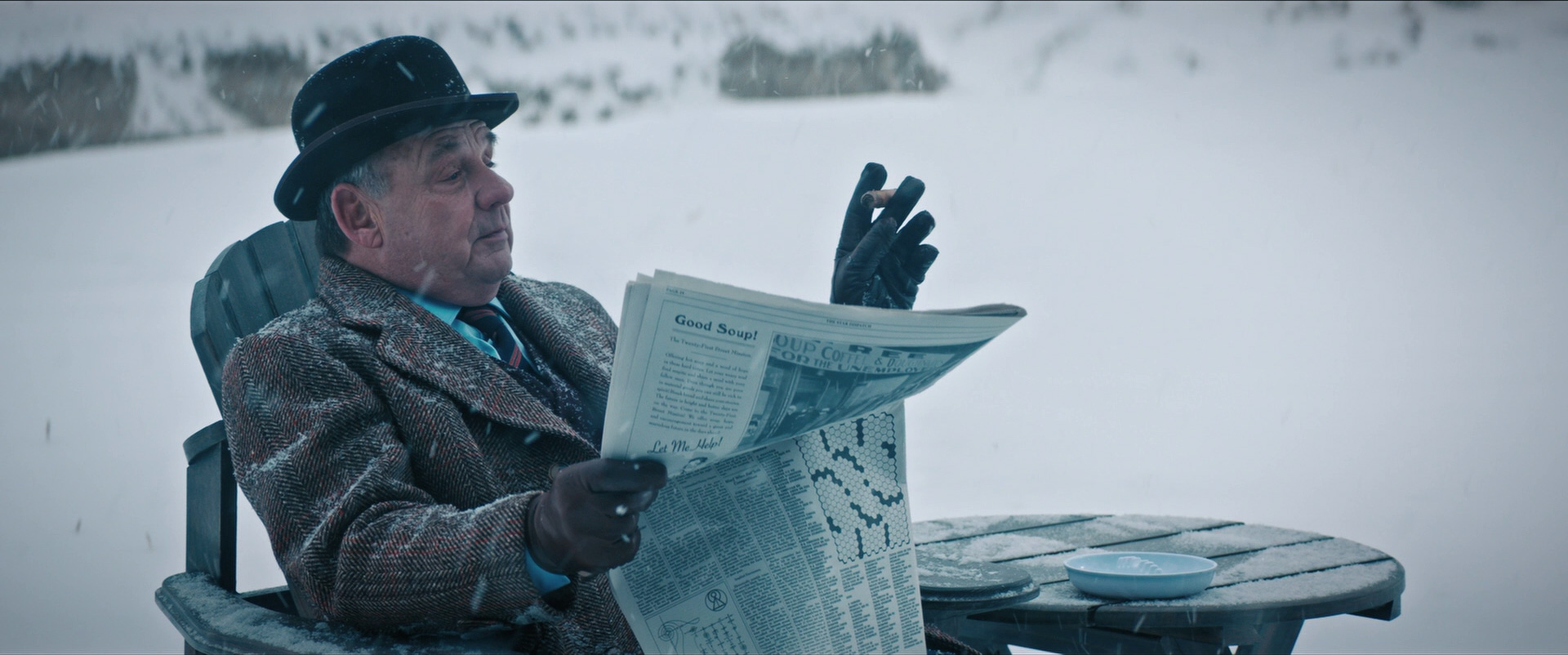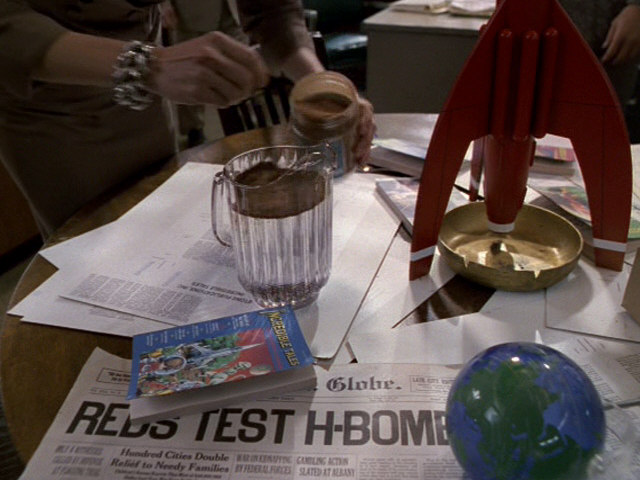 The front page of the New York Globe with the headline "Reds Test H-Bomb" can be seen in the illusory scenario of this episode, but it is not close enough to identify any paragraph text in SD.