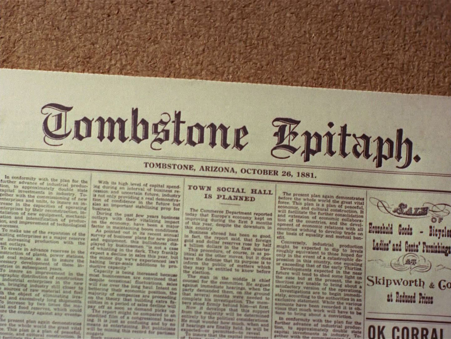In this episode we can see a newspaper page from the Tombstone Epitaph of October 26, 1881. The place and date, together with the mention of "OK Corral" in the fifth column, is a broad hint what the story is about. The Tombstone Epitaph is a real-life newspaper that gained fame for its coverage of the O.K. Corral gunfight.