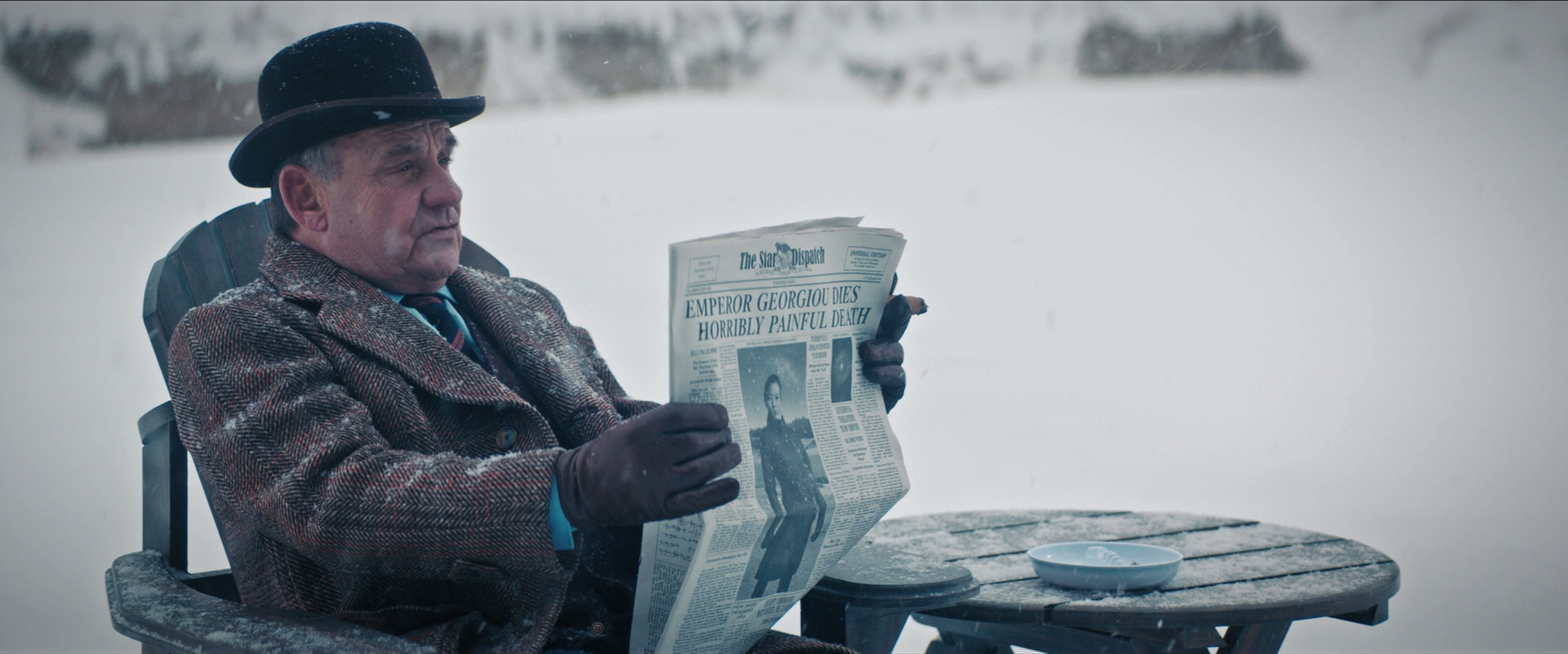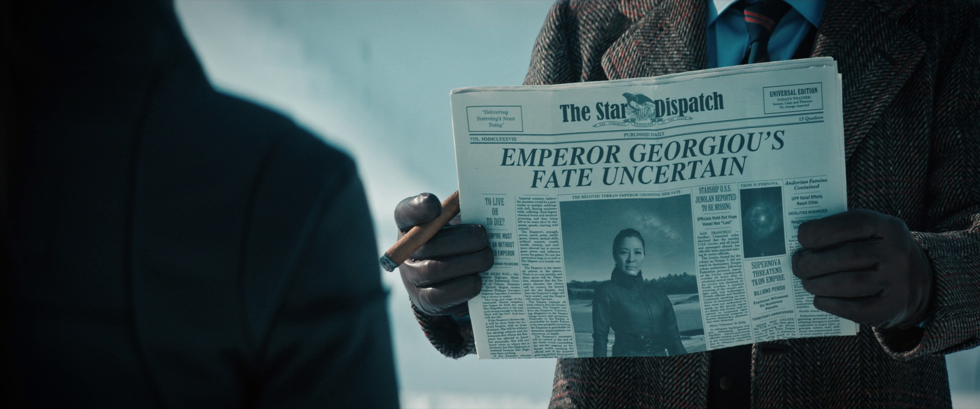 In the first part of the double feature, Carl (the avatar of the Guardian of Forever) is holding a newspaper named The Star Dispatch, just like in TOS: "The City on the Edge of Forever". The main headline reads "Emperor Georgiou Dies Horribly Painful Death". The text of the article is custom-made and seems to be all about the Terran Emperor. The other articles are in-jokes: "Starship U.S.S. Jenolan Reported to be Missing" refers to TNG: "Relics", "Supernova Threatens Tkon Empire" to TNG: "The Last Outpost". There is also a mention of a famine on Andoria. The newspaper costs "15 quatloos" (TOS: "The Gamesters of Triskelion"). The volume is identified as "Vol. MMMCLXXXVIII", which is correct for the current year 3188.