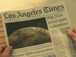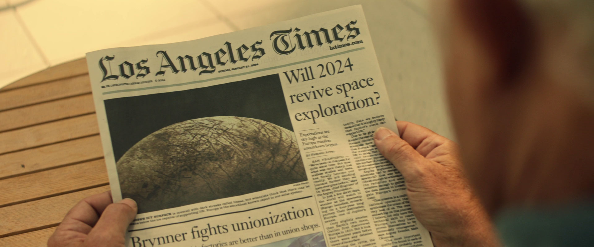 Q reads an issue of the Los Angeles Times at the end of PIC: "Watcher". The paper is dated Sunday, January 21, 2024 (about three months ahead of La Sirena's arrival to the past). The main headline "Will 2024 revive space exploration?" is about the upcoming Europa mission. We can also see an article titled "Brynner fights unionization", obviously referring to Christopher Brynner (DS9: "Past Tense").