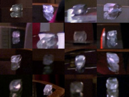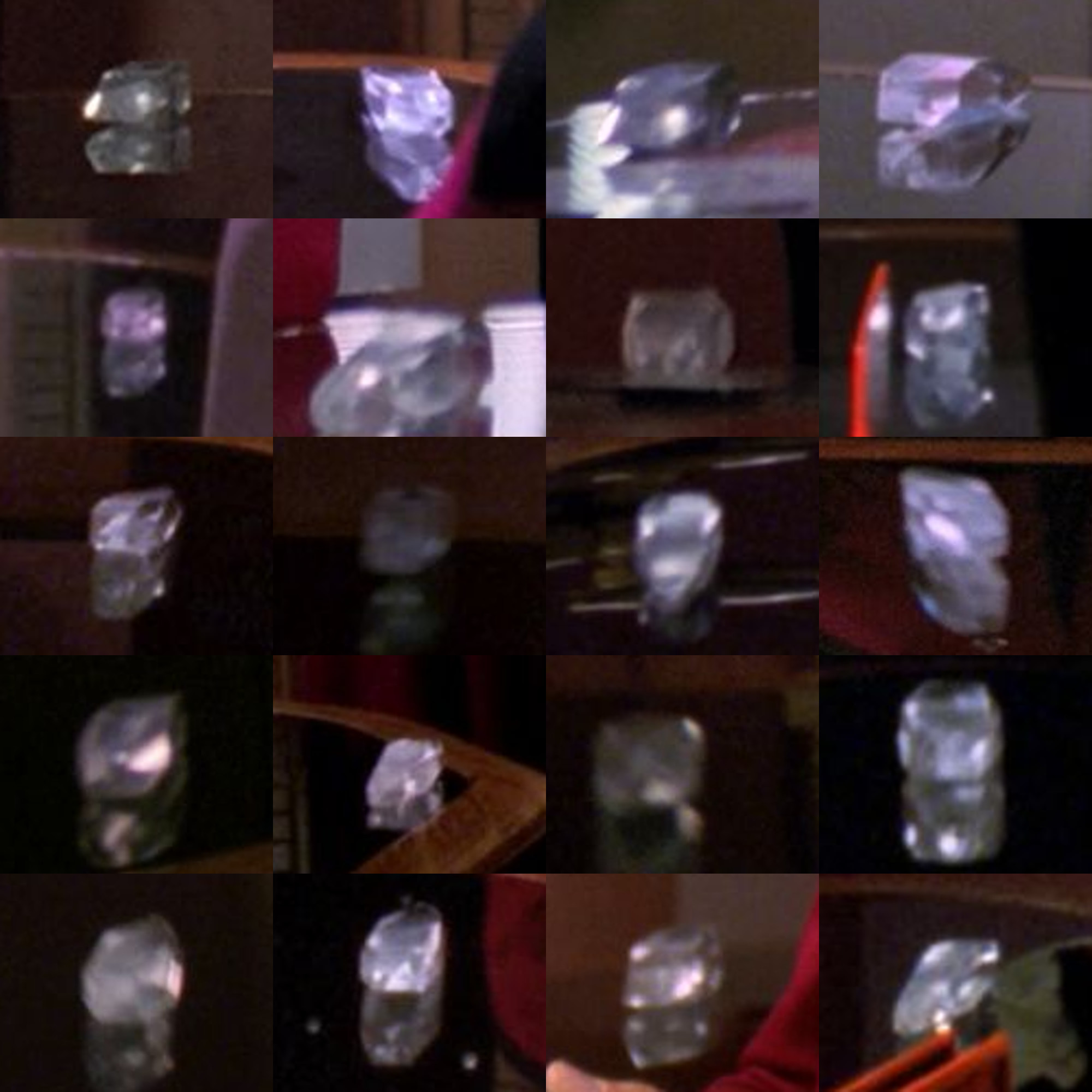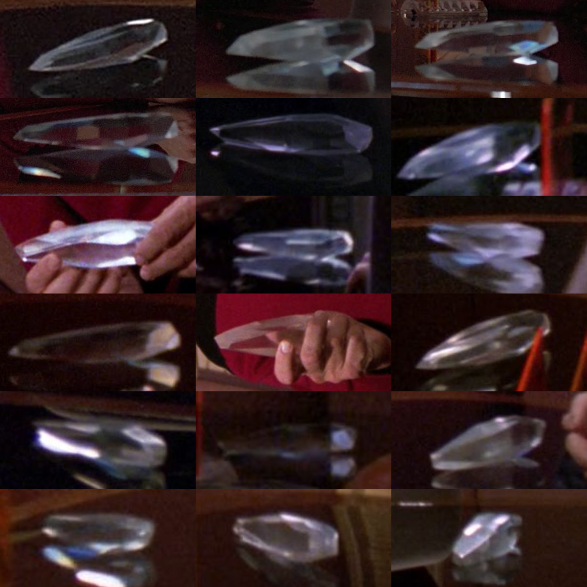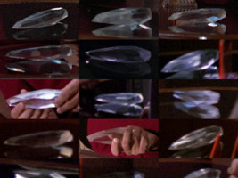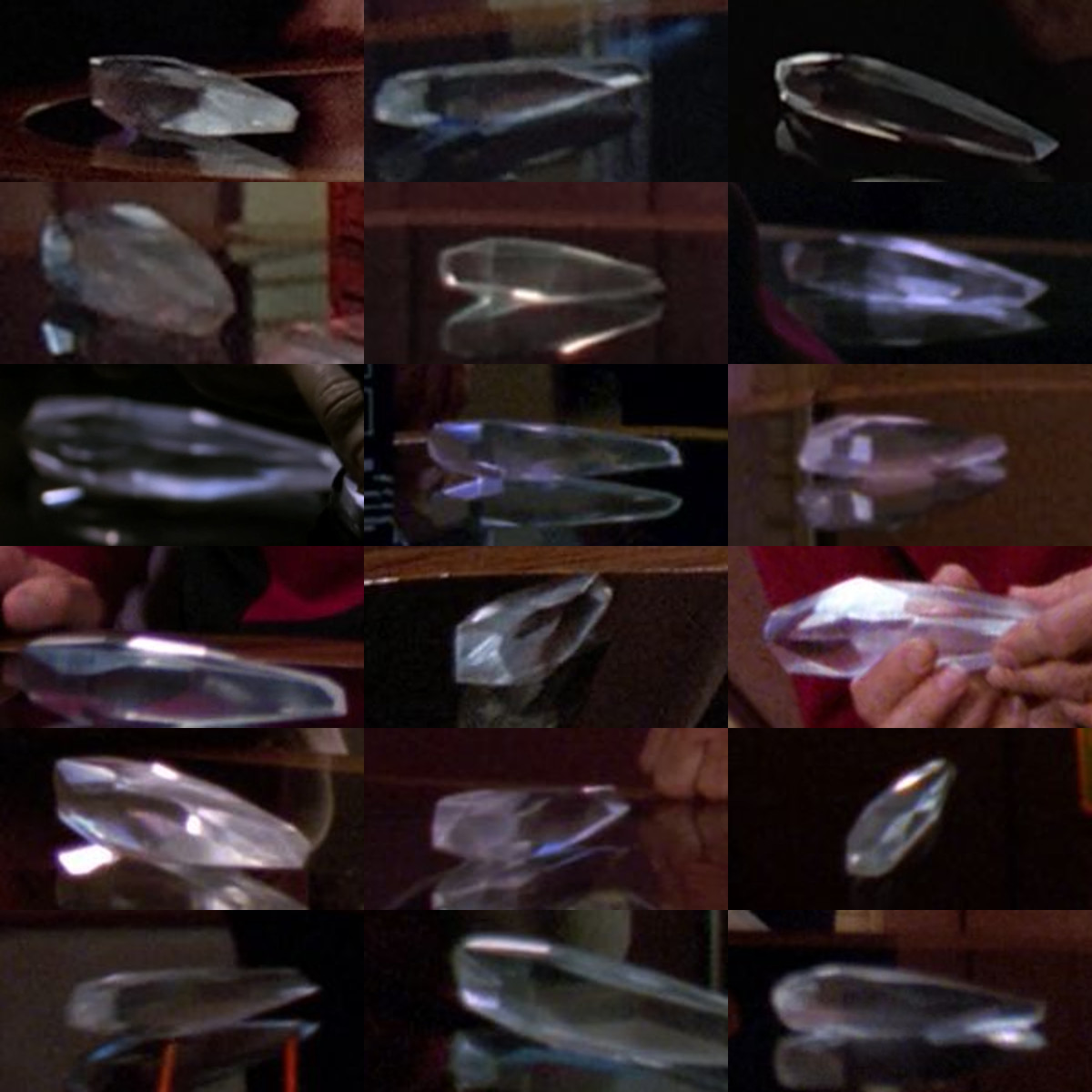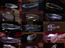 We have compiled collages of good shots of the crystal from all seven seasons of Star Trek: TNG. As mentioned earlier, the crystal has a pointy end and a more blunt end. Here are collages of the crystal with the pointy end facing to the left and to the right (sometimes right side up and sometimes upside down). There's also a collage of shots showing the two "ends" of the crystal. In each of these collages, the images at the top are from earlier episodes and the shots at the bottom are from later seasons. As can be seen, the prop is always the same and no longer changes after its introduction in season 2. Finally, as the crystal is best seen in "The Masterpiece Society" when Picard plays with it, here's also a collage of shots from that episode.