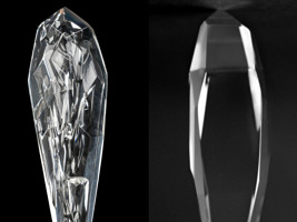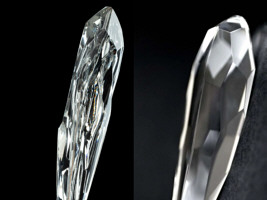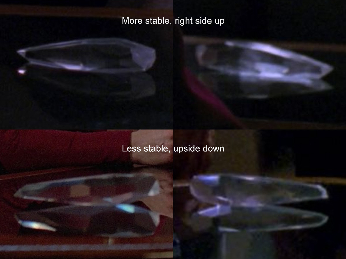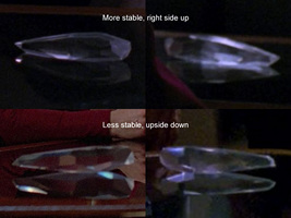 But there's more to this! Some background needs to be given first, though: When put on the table, there are two possible orientations for the crystal, the more stable position (right side up) and the less stable position (upside down) which has less contact with the table. Look at the reflection on the table and you'll see the difference.