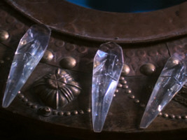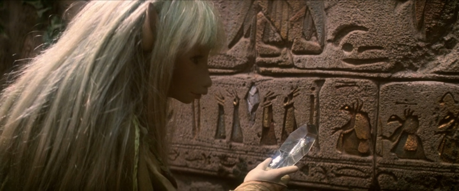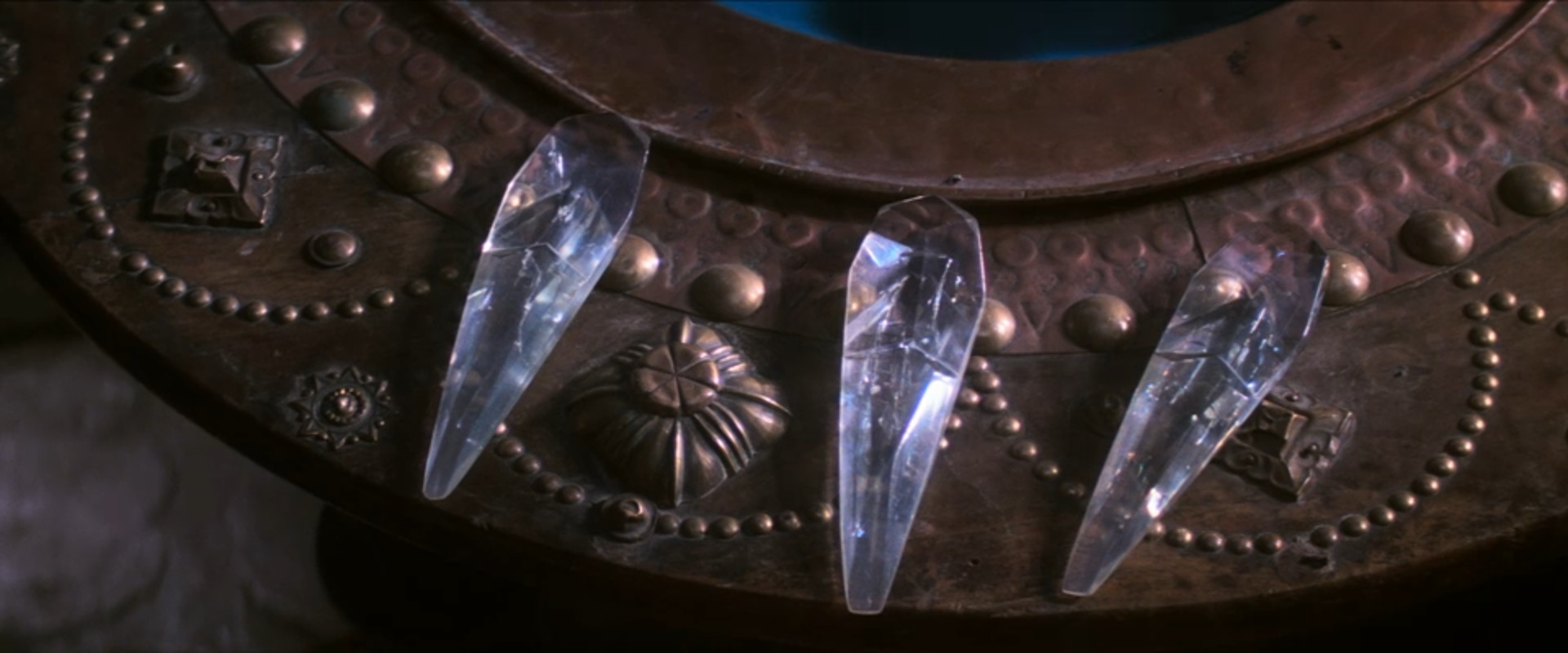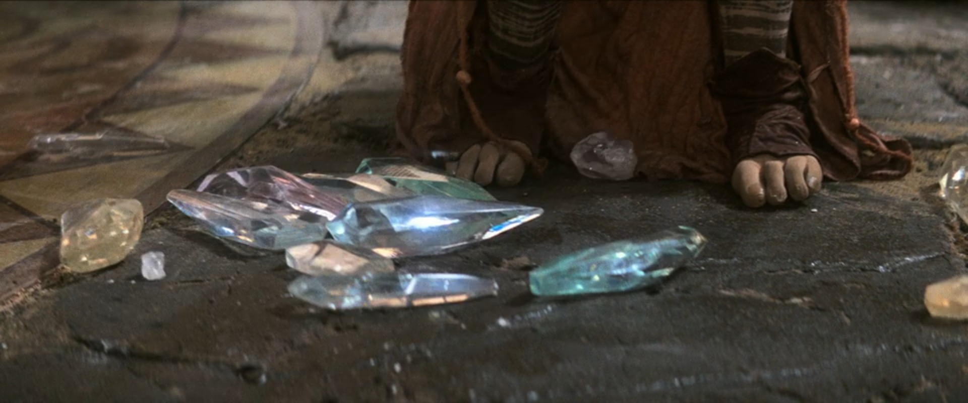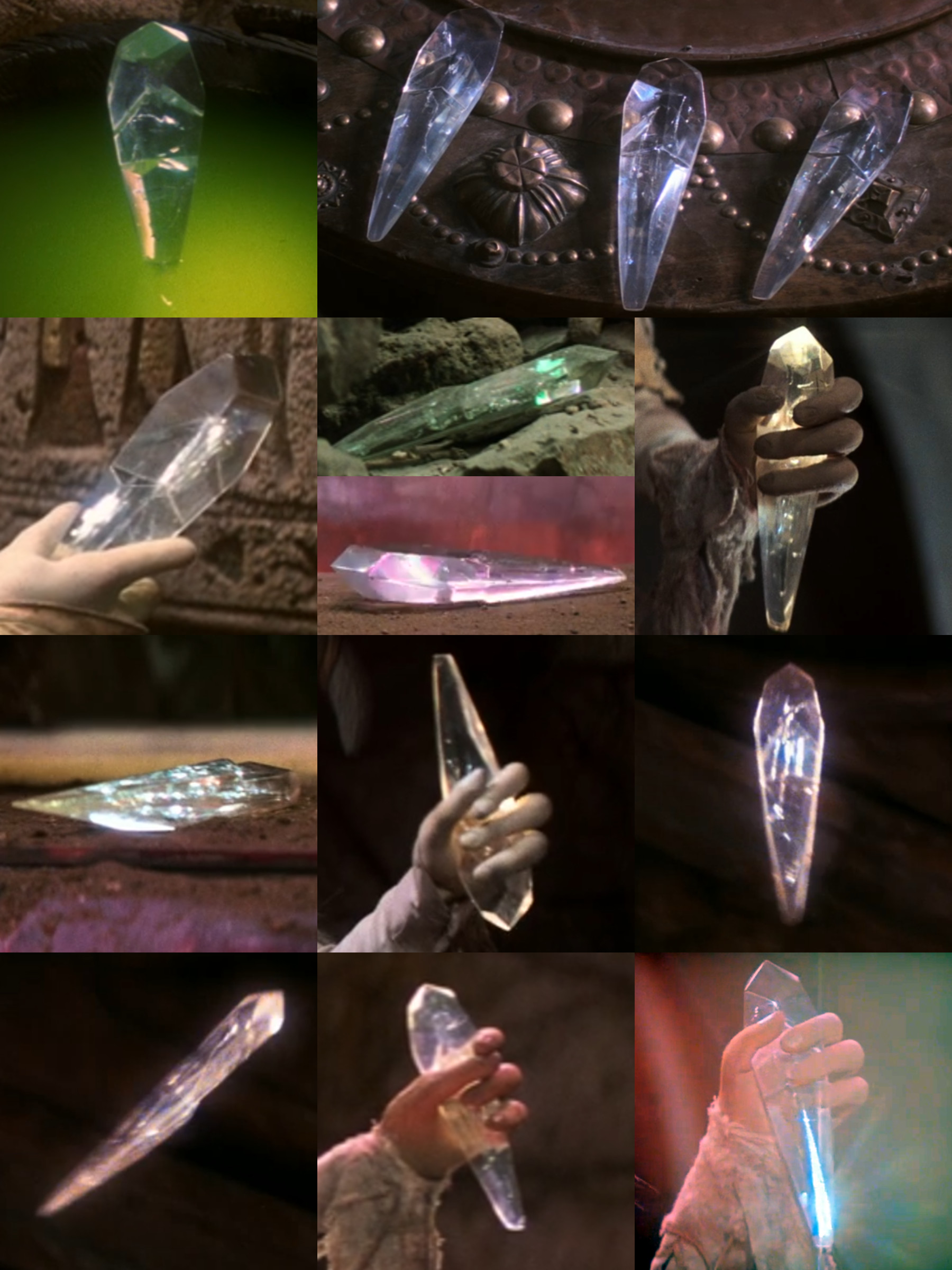 There's however one scene in the film where the wise character Aughra drops several different crystals on the floor. The crystals are all shaped and tinted differently. One of these crystals might possibly have been the basis for one of the two ready room crystals seen on TNG, handed down from one prop maker to another - or maybe it might not have.