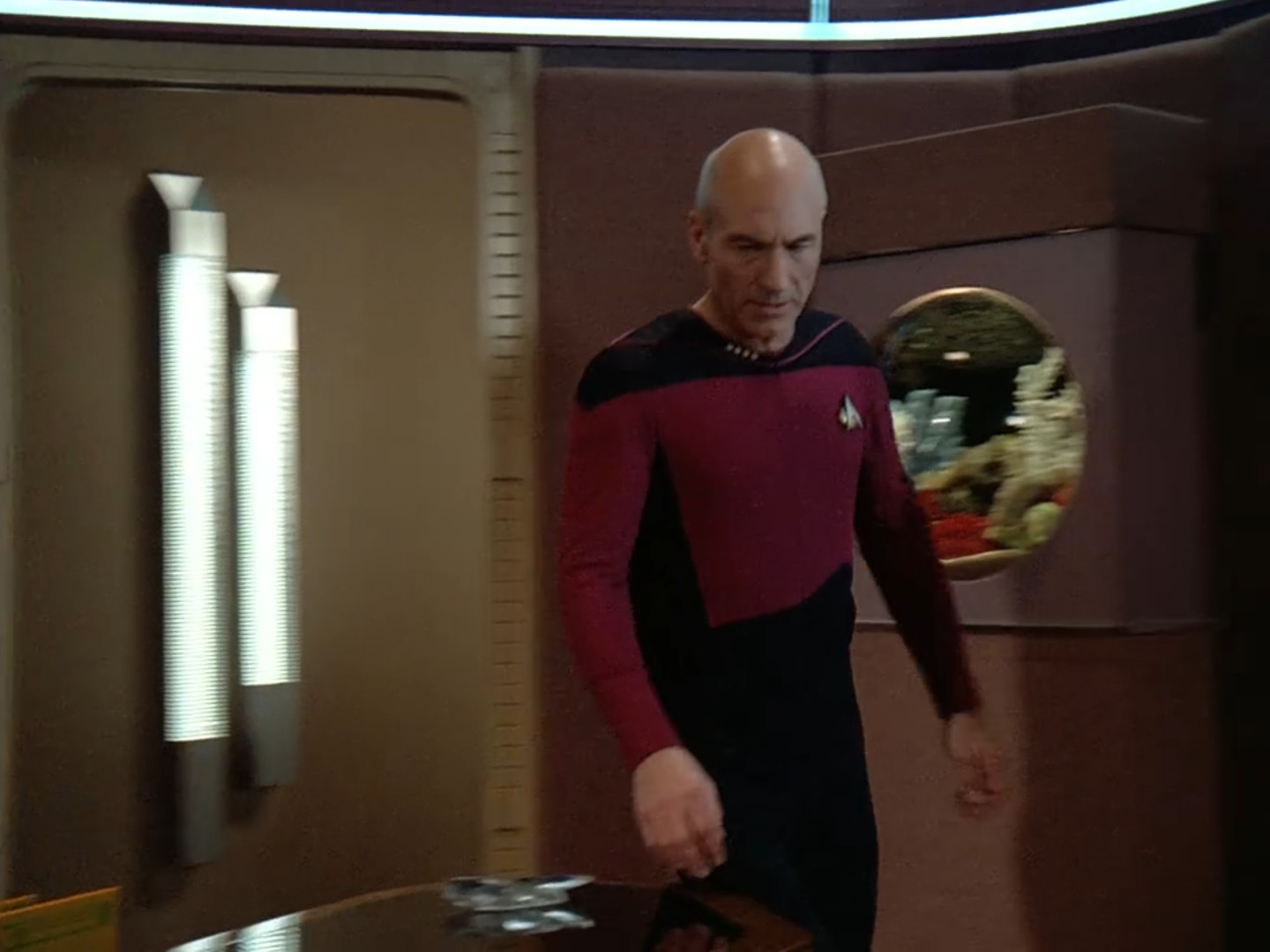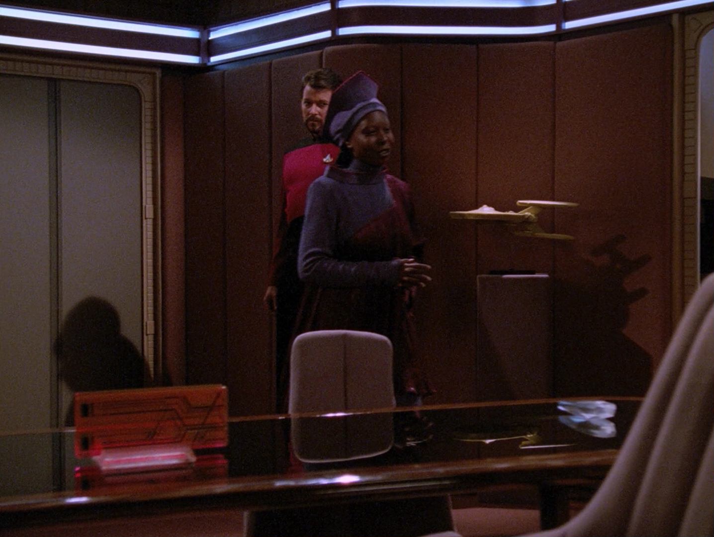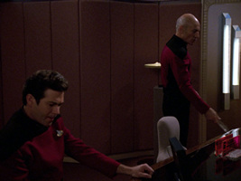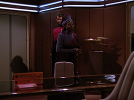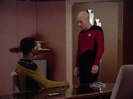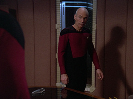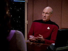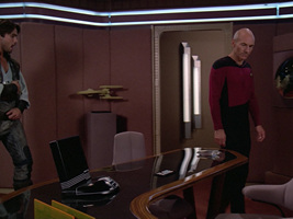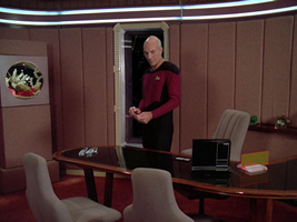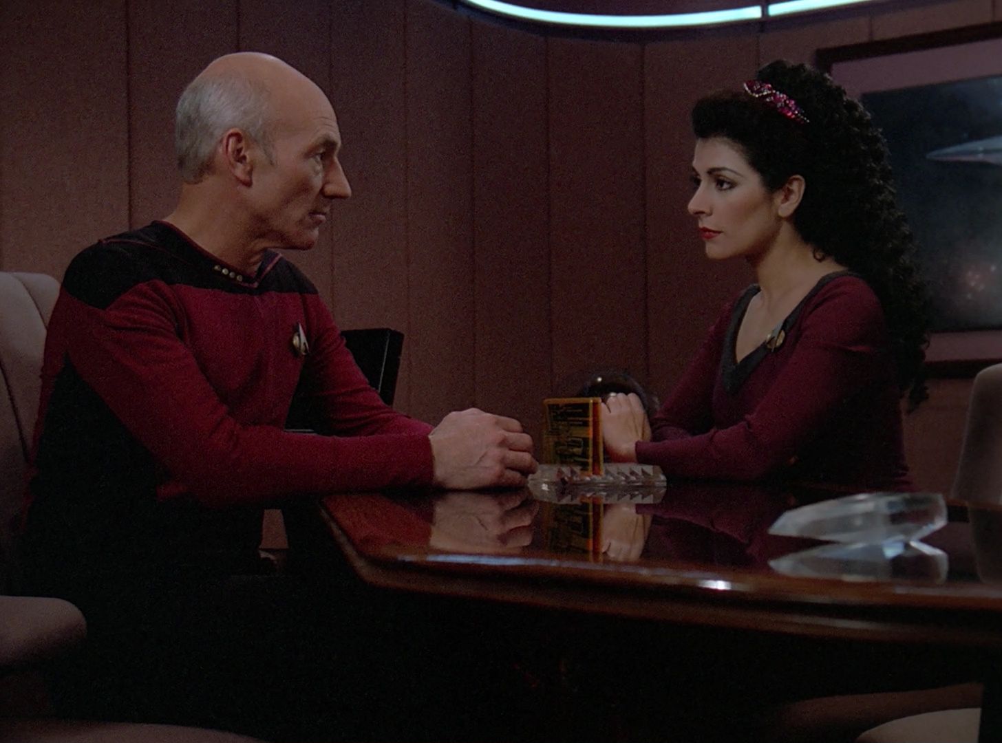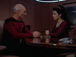 Picard and Troi have two meetings in the ready room in this episode. In the first and very tense one, Troi tells Picard that she is resigning her duty as she no longer feels qualified as ship's counselor due to the loss of her telepathic abilities. Picard plays with his crystal right before and during the second meeting with Troi. He knows he has to convince her somehow to use her skills to help the Enterprise communicate with the two-dimensional alien lifeforms, even though she has lost faith in her abilities and is dejected.