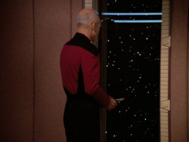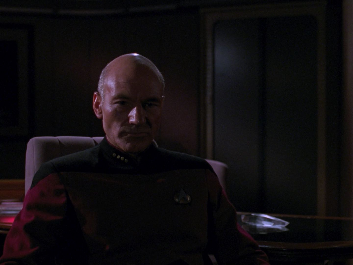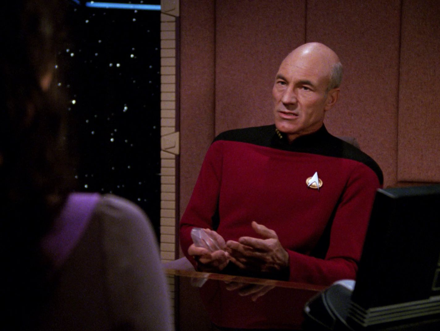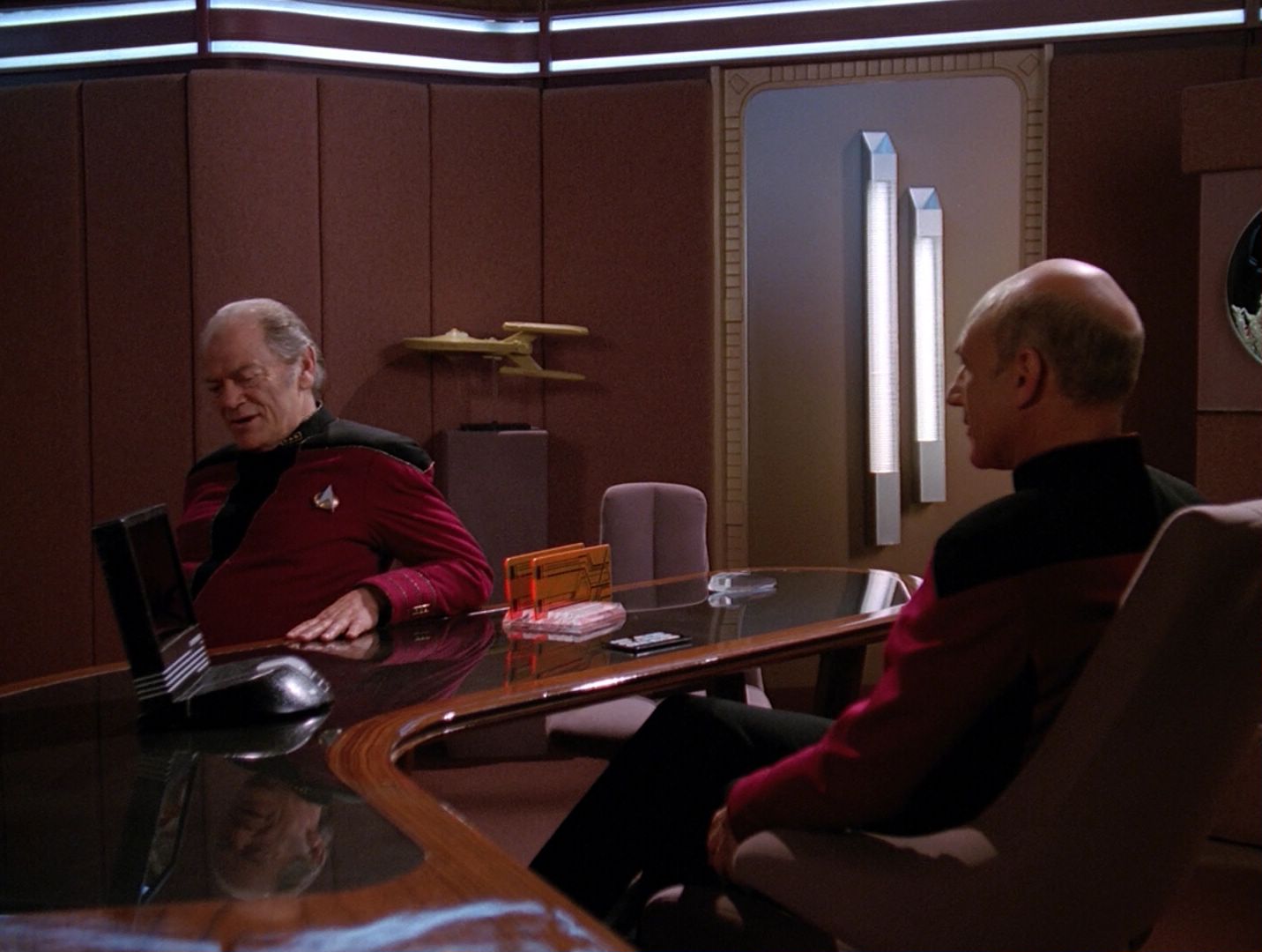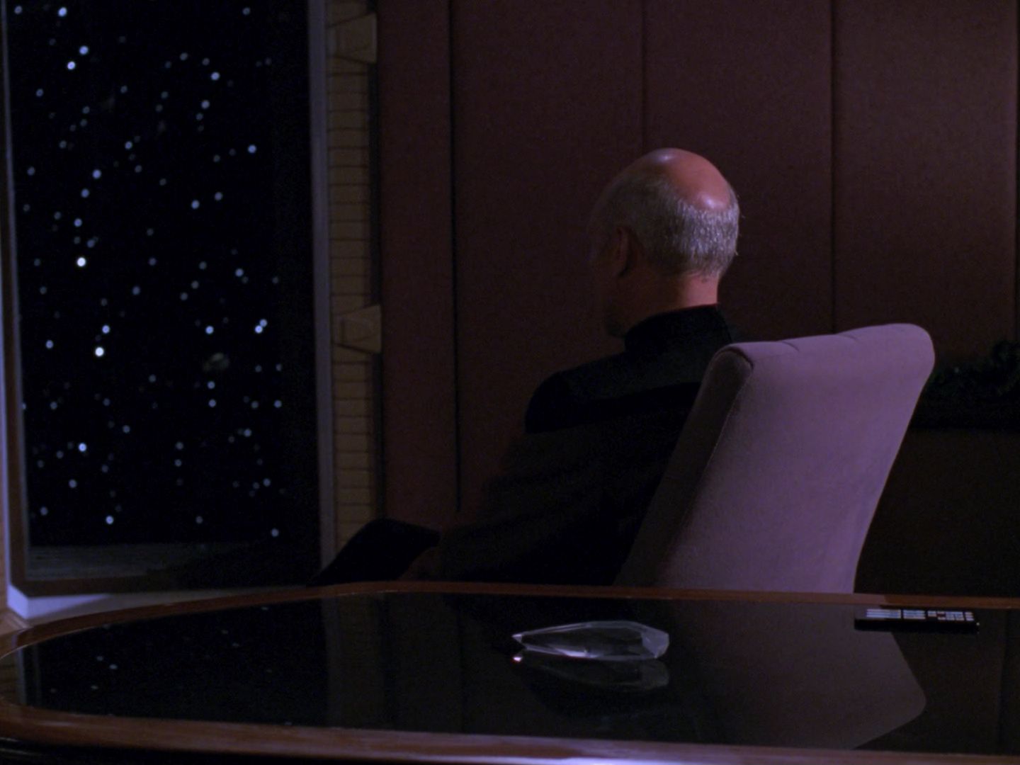 Picard plays with his crystal and looks out the ready room window before his lengthy discussion with Rasmussen even begins. Picard is in a real moral quandary here and asks Rasmussen for information about the fate of Penthara IV to save the lives of more than 20 million people on the planet. He knows that Rasmussen will not easily reveal information about the future of the planet, so this is a tense (and wonderful!) discussion between the two.