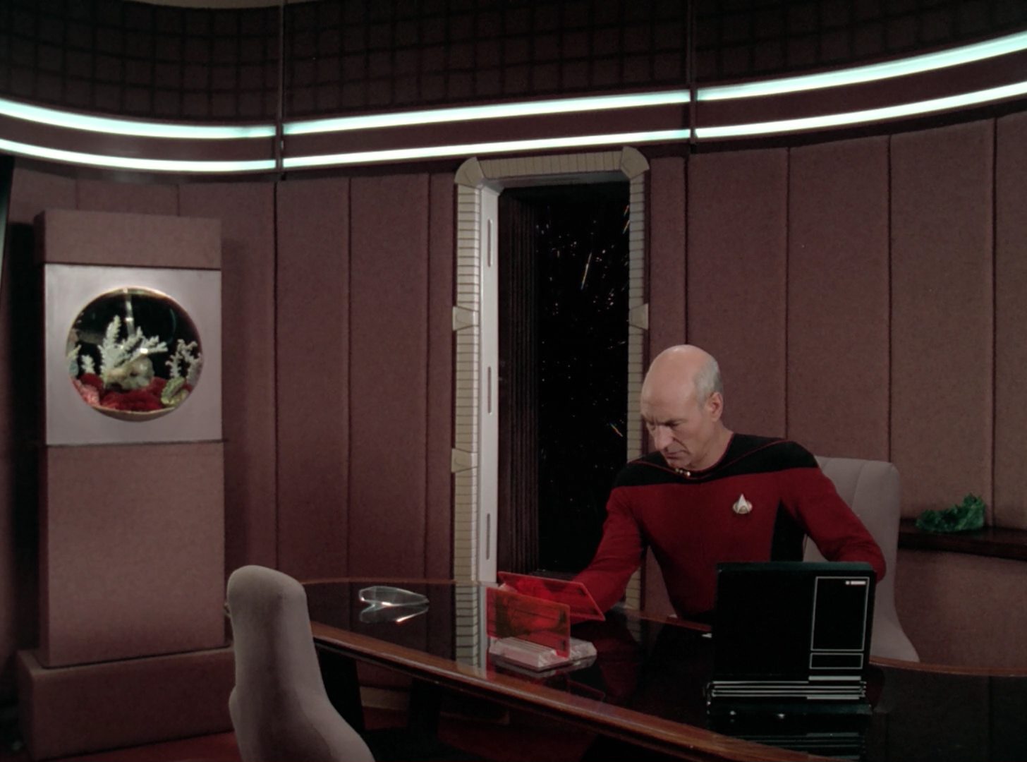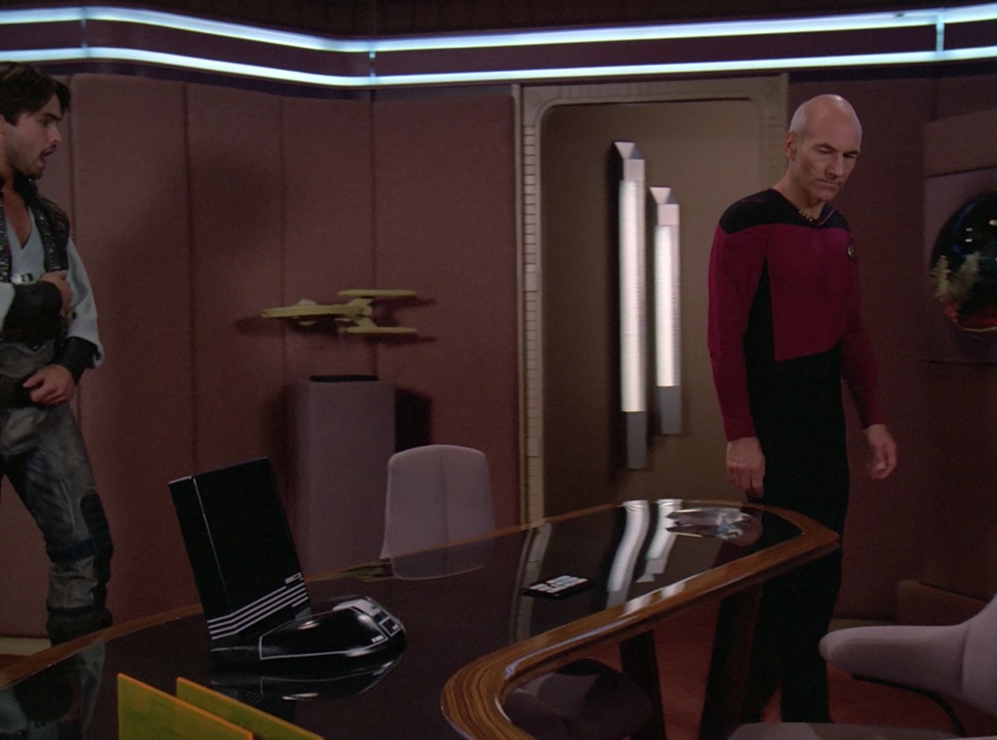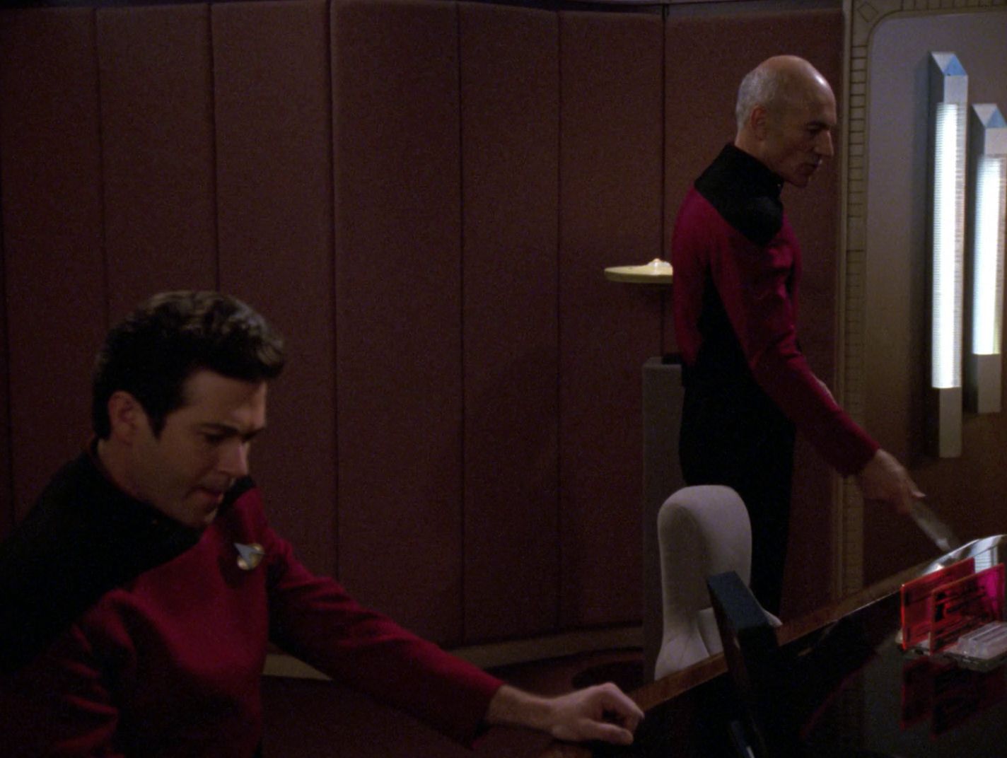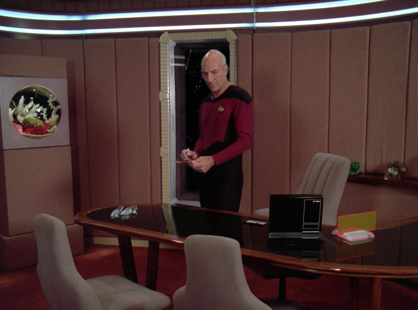 Picard plays with his crystal and looks out the ready room window before his lengthy discussion with Rasmussen even begins. Picard is in a real moral quandary here and asks Rasmussen for information about the fate of Penthara IV to save the lives of more than 20 million people on the planet. He knows that Rasmussen will not easily reveal information about the future of the planet, so this is a tense (and wonderful!) discussion between the two.