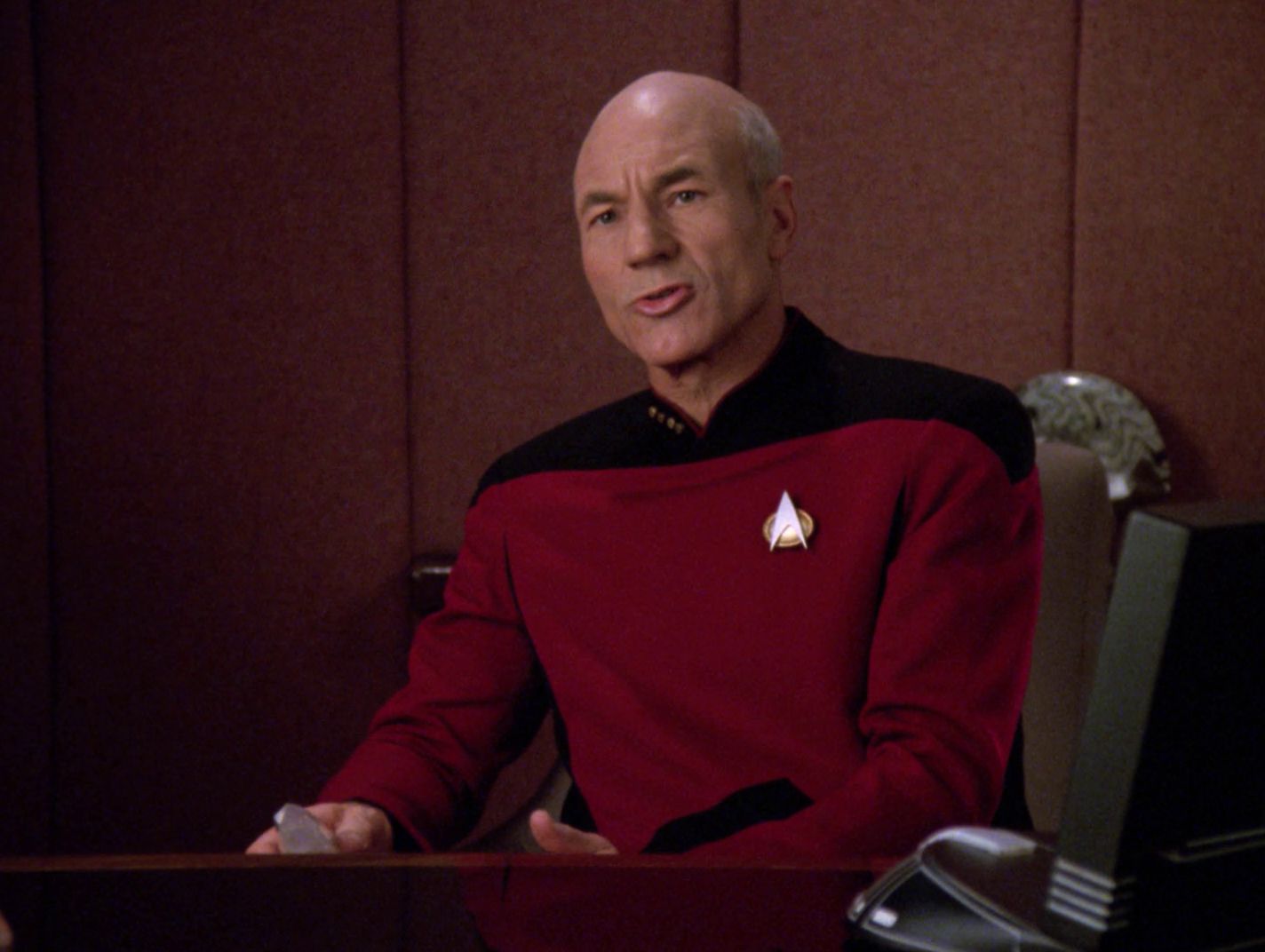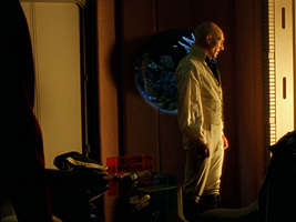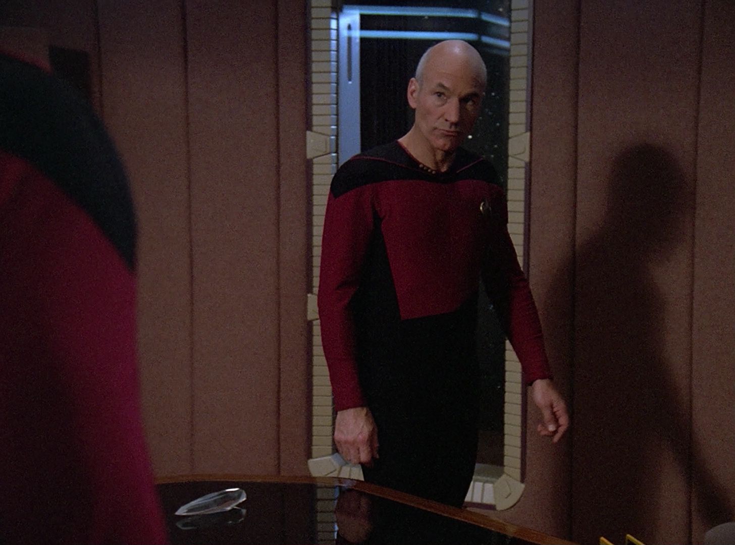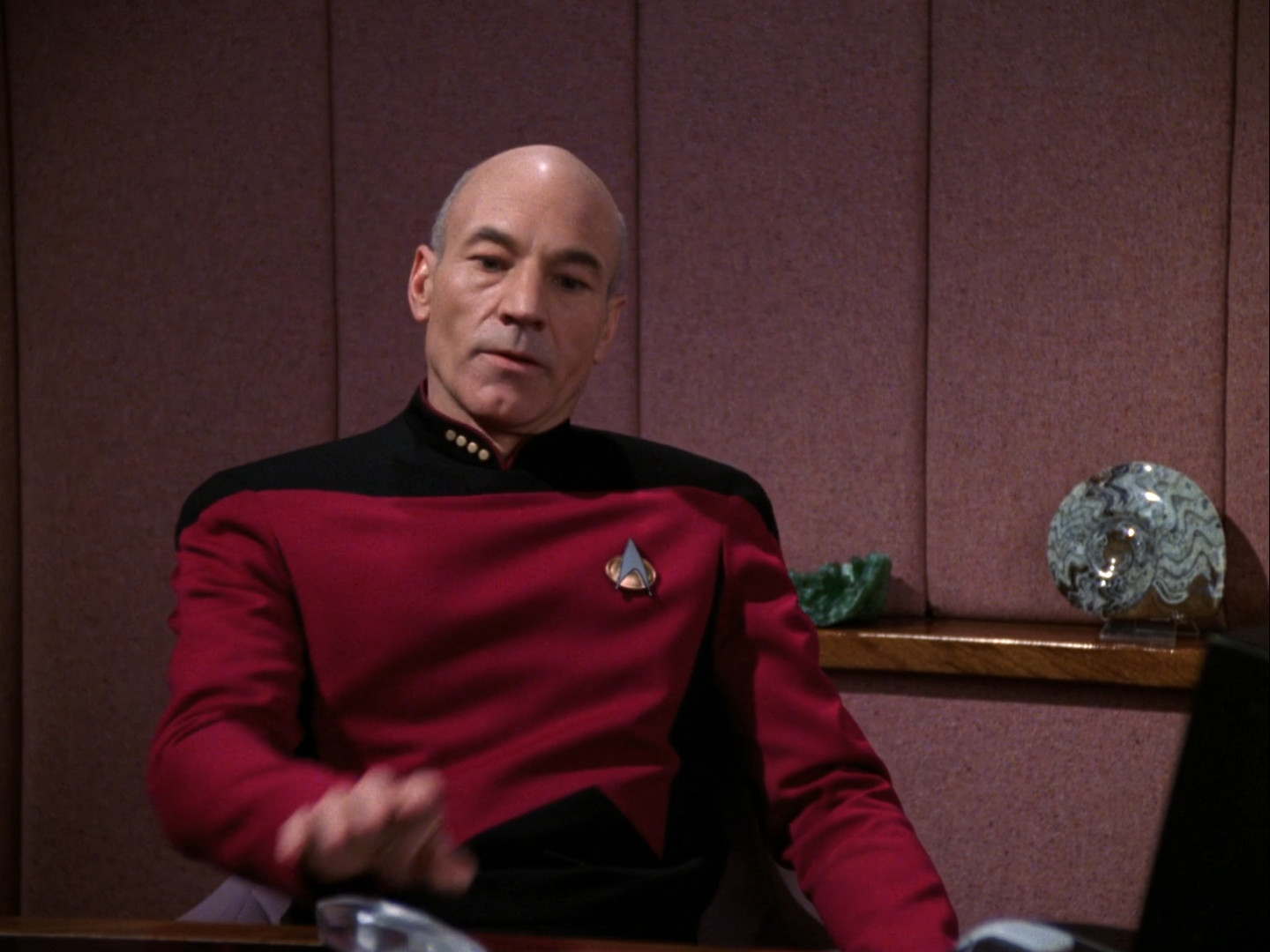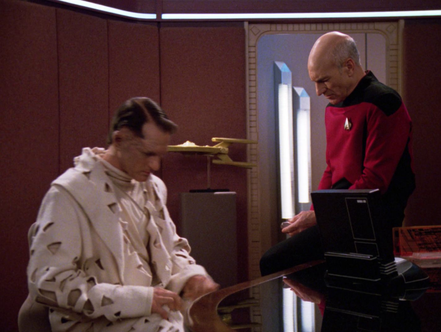 Picard plays with his crystal and looks out the ready room window before his lengthy discussion with Rasmussen even begins. Picard is in a real moral quandary here and asks Rasmussen for information about the fate of Penthara IV to save the lives of more than 20 million people on the planet. He knows that Rasmussen will not easily reveal information about the future of the planet, so this is a tense (and wonderful!) discussion between the two.
