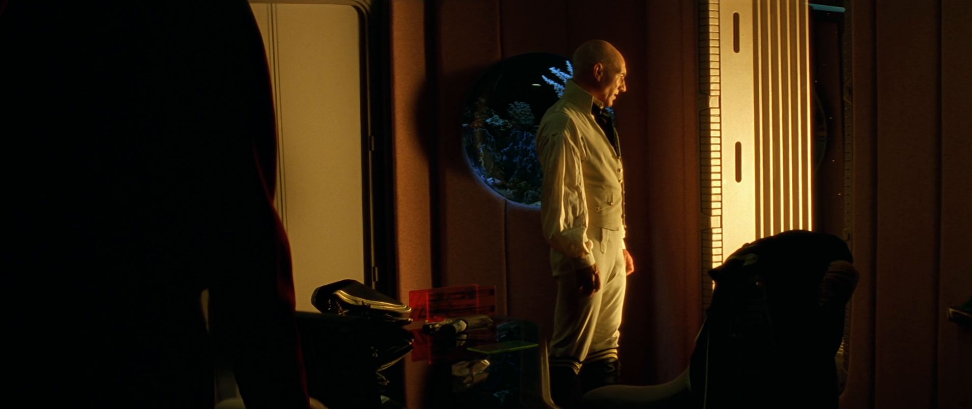 When Picard sits alone in his darkened ready room, as the aceton assimilators have drained the ship of all its power, he has to decide whether or not to follow La Forge's plan and turn control over to the computer - a decision weighing heavily on the captain. Notice how in these shots, the very prominent crystal is a source of both clarity and light and again looks like a small ship on a dark ocean. I love this shot!
