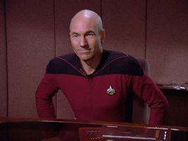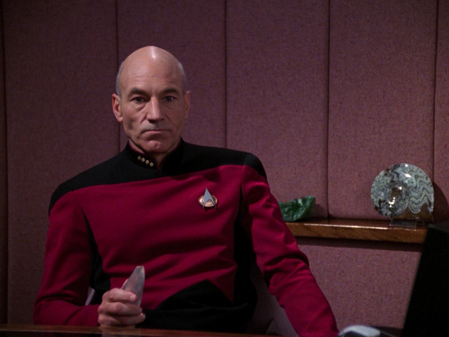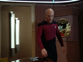 Only a few episodes later in "Suddenly Human", Picard is again in a difficult situation, as he tells Troi, who has never "heard an explanation so well-rehearsed", that he cannot assume a fatherly role for Jono/Jeremiah Rossa. Troi tells him that there is no way around it and that he has to fulfill his duty here. As a reaction to that, Picard (gently) tosses the crystal on his desk in frustration, as Troi leaves.