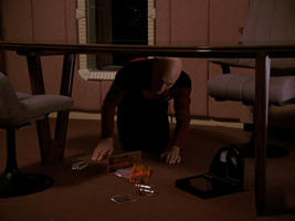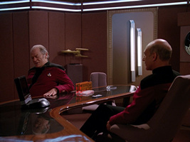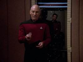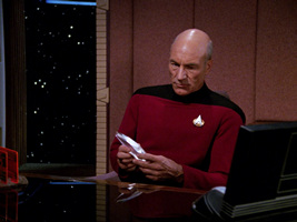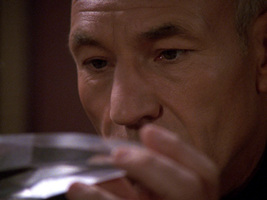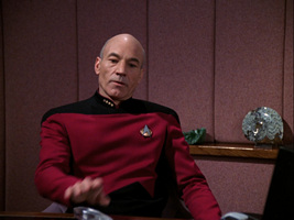 This is the only one of the 7 episodes in which Picard is seen holding the ready room crystal when the Captain is not dealing with a personal or moral dilemma. He plays with the crystal under his desk when he is talking to Jev about his father, who is thought (at this point) to be responsible for the cases of telepathic memory invasion on the Enterprise-D. It seems as if Picard feels a little uncomfortable when talking about such a matter with the son of the "perpetrator" and his playing with the crystal (when sitting at and later on his desk) is rather subdued. But again, the crew has solved the riddle of what has happened to the unconscious people on the Enterprise-D and other alien planets whenever the Ullian delegation has been close - the memory invasions will cease from now on and no one will be affected by this in the future.