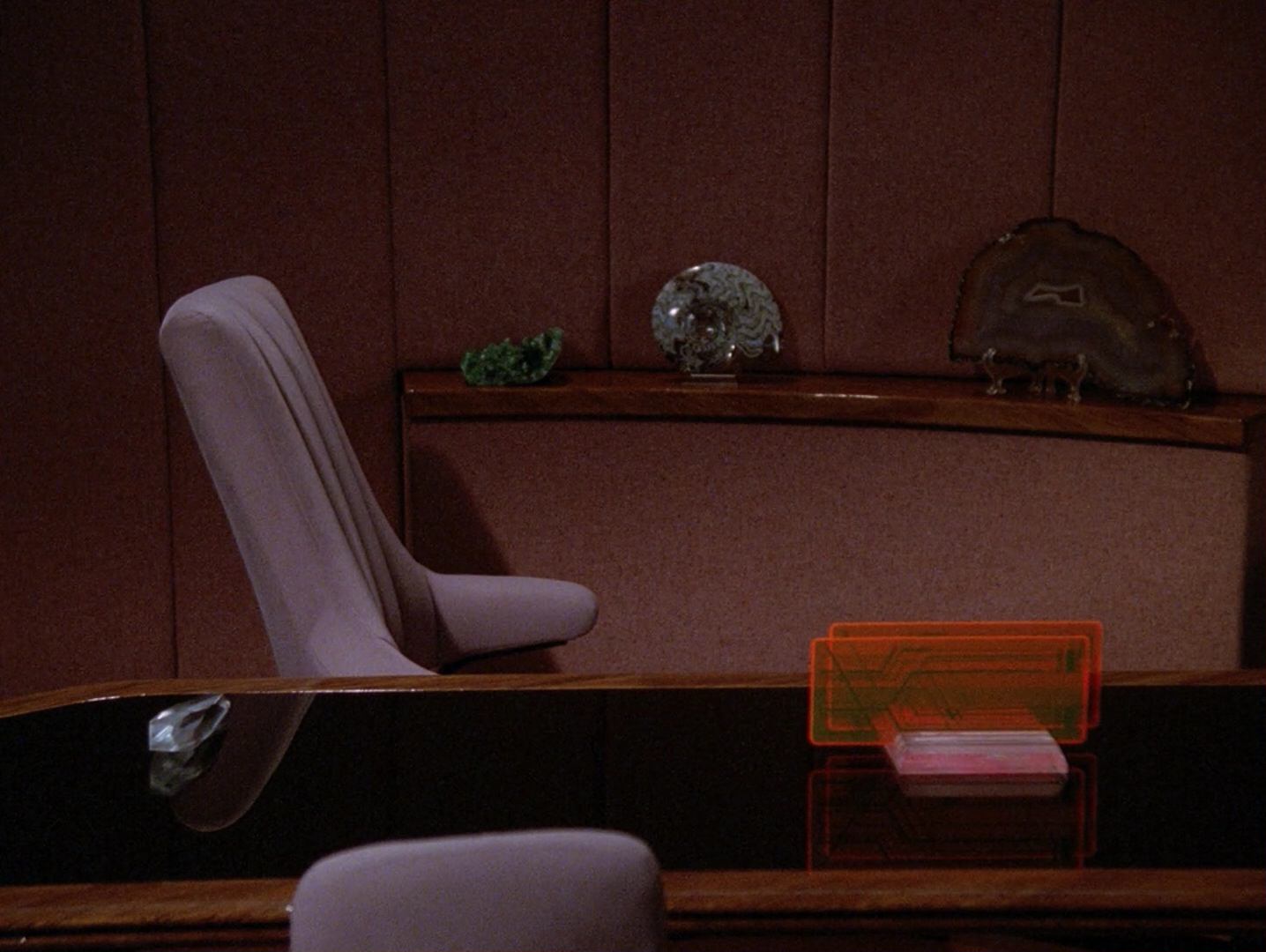 This is the first time the crystal is properly seen on its own (in all earlier season 2 episodes, the second crystal was always right next to it) and it is really set in scene here. While Picard and Troi are discussing how dangerous Anya might be, the camera, which is located in front of the rounded end of the ready room desk, slowly moves from left to right, always keeping the focus on Picard and Troi. As the crystal is located at the end of the desk, it is beautifully showcased in this scene and seems to gently move from the right side of the frame to the left side, like an iceberg or a small ship on the ocean - complete with a reflection. This is quite beautifully filmed and framed!