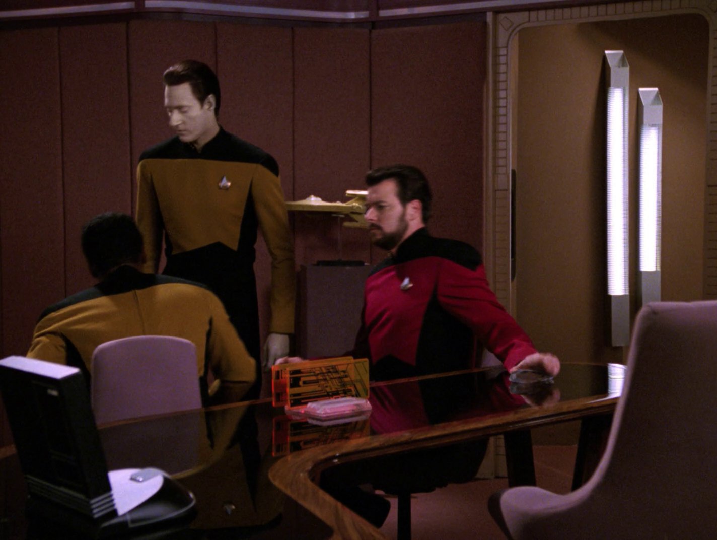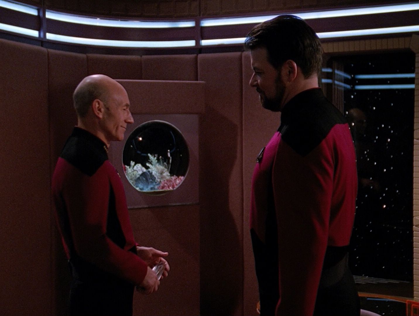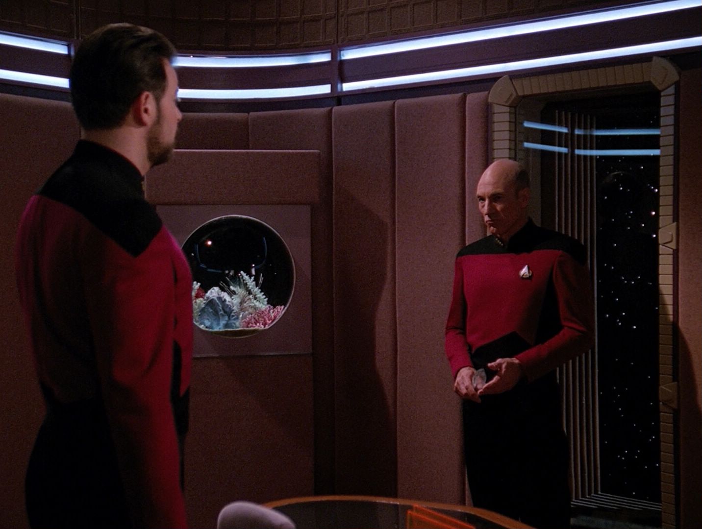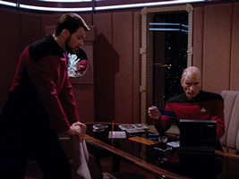 On two occasions, Riker is also seen playing with Picard's ready room crystal. He is the only person besides Picard who ever touches the crystal.