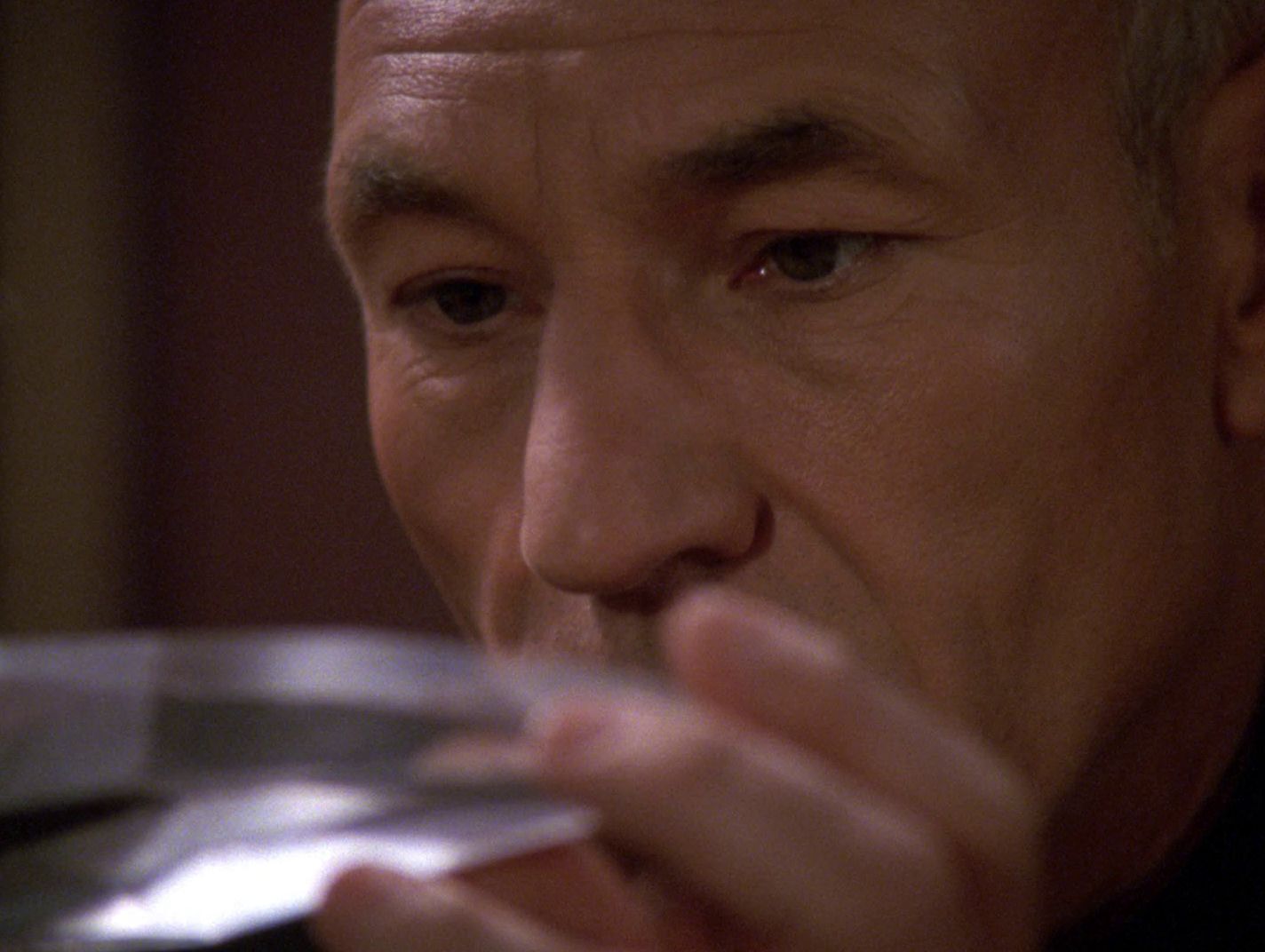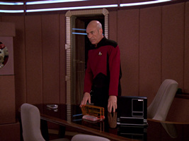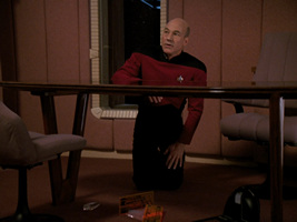 Due to small spatial deformations in the Mar Oscura nebula, which also form in the ready room, all the items on Picard's desk fall to the floor, including his crystal. The first items he picks up when he puts everything back into its place are his Bodum tea cup and tray.