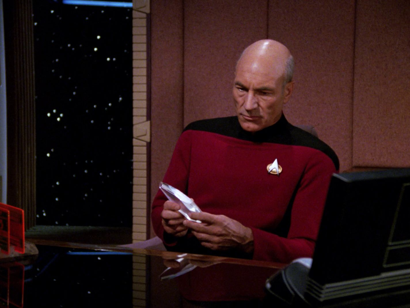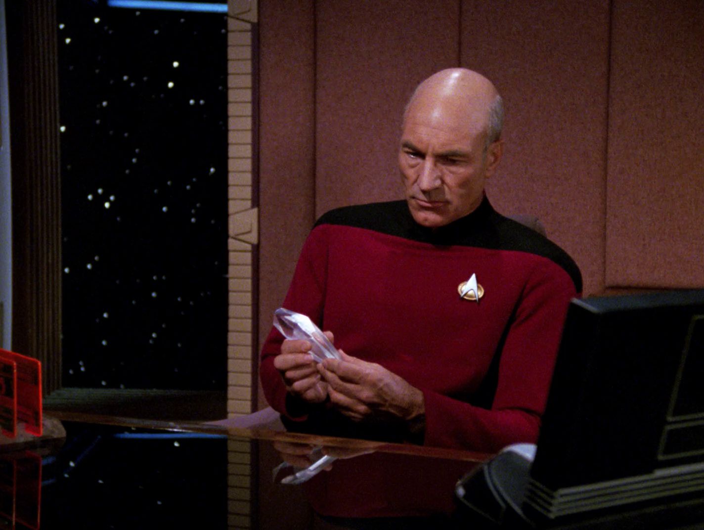 When thinking about Picard's ready room desk on the Enterprise-D, there are three items that can always be found on it: Picard's black desktop monitor, his rack of orange isolinear circuits and finally his crystal. Picard uses the monitor all the time to communicate with Starfleet admirals or representatives from alien planets. He is sometimes seen "reading from" or "writing on" one of the orange isolinear circuits, using them like a PADD. But what can be said about the most unassuming object on his table, the ready room crystal? Much more than we originally anticipated!