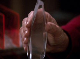 Picard is seen holding the crystal for the first time in "The Best of Both Worlds I", looking out the window when talking to Riker in the ready room. It is clear that he has to make a tough decision or say something that he would rather not say here, as this is the moment when he tells Riker to accept the promotion offered to him and become Captain of the Melbourne. He accepts Admiral Hanson's reasoning that it's high time Riker accepted a promotion and that Picard should "kick him in the rear for his own good" but telling Riker this is not easy for Picard.