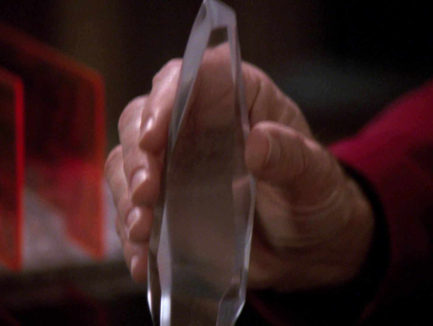 Riker is seen holding the crystal (gently rubbing it with his thumb) during the whole tense ready room discussion towards the end of the episode when Picard has to decide whether or not to call the bluff of the Romulan commander, even though Riker's hand holding the crystal is at first hidden behind Picard's orange isolinear circuits. When Picard has made his decision at the end of the scene, Riker gently drops the crystal on Picard's desk.