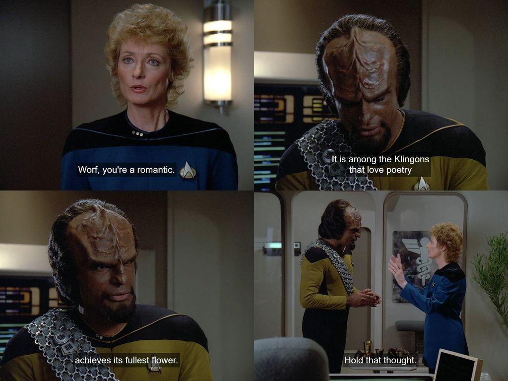 Jay-Den Kraag mentions Klingon love poetry in #StarfleetAcademy's "Vox in Excelso", but we've heard about Klingon love poetry before: Worf talked about it in two #StarTrekTNG episodes, namely "The Dauphin" (2nd pic) and "Up the Long Ladder" (3rd pic). :-)
