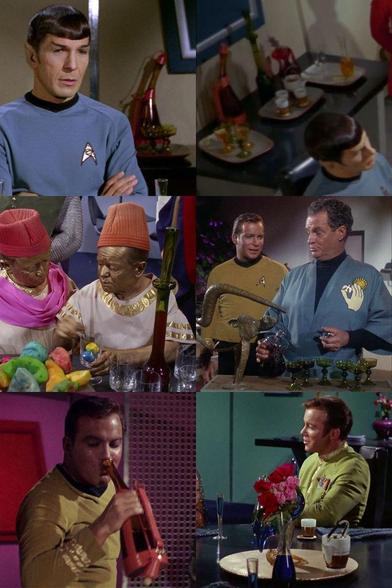 Apart from some new bottles, first seen in #StarTrekTOS' "Let That Be Your Last Battlefield", the episode also features a Saurian brandy bottle ("The Enemy Within"↙️), a Kluk Kluk bottle with a pink liquid ("Dagger of the Mind"➡️), a coffee set ("is There in Truth..."↘️) and a tall bottle ("Journey to Babel"⬅️).