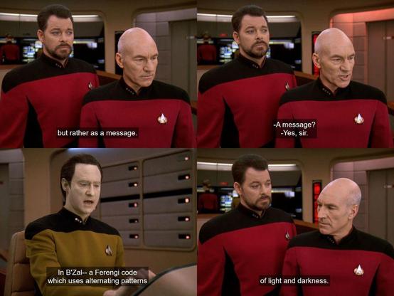 Whenever I watch #StarfleetAcademy's "Kids These Days" (1x01) and "Vox In Excelso" (1x04) on my TV (but not on my computer!) I get these strange light flashes in the first 10 seconds of the end credits. Does anyone else experience that? I feel like I'm being sent a secret message in Ferengi B'Zal! 😅