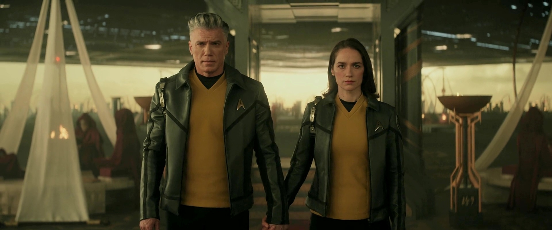 The season finale begins lightheartedly with Batel's return and a captain's dinner. Scotty joins for the first time, dressed in formal attire because Uhura told him so, while everyone else knows this is a casual occasion. This is a nice callback to "Children of the Comet", where Uhura was the newbie and wore her dress uniform. There is a moment during the dinner when Chapel mentions a place called Cali-Katchna on the planet Skygowan, where Roger Korby is working. This alarms Batel because the name phonetically resembles something the Vezda said in "Through the Lens of Time". Unfortunately, this ominous foreshadowing comes across as verbose, which undermines its impact.