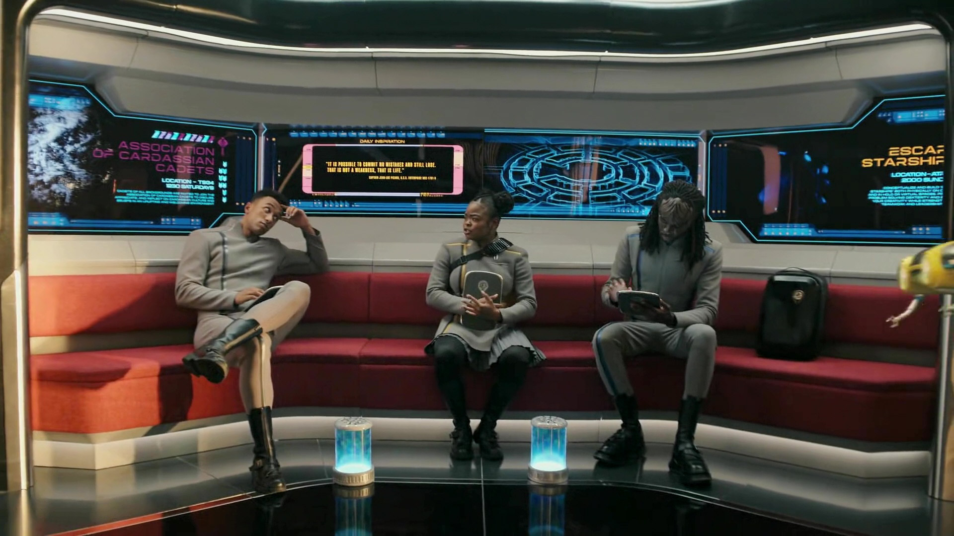 The 32nd century emblem reappears in yellow in Caleb Mir's criminal record in SFA: "Kids These Days" and in purple to represent the Association of Cardassian Cadets in "Beta Test".