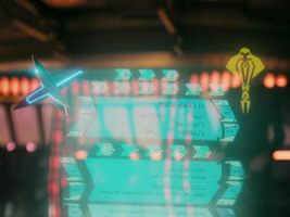 We can also see the emblem in the form of a large lighted wall display in DS9: "Things Past". Although we just see the lower part of the logo, we can confirm that area #4 is dark salmon and the rest bright salmon. The same emblem is visible in DS9: "Wrongs Darker Than Death or Night" and therefore as early as 2346. It is actually the earliest appearance of any Cardassian emblem in the fictional chronological order. Finally, variant 4 appears on maps in DS9: "Tears of the Prophets" in 2374. Whilst the logo does not have a border when shown as a sticker or as a wall lamp, it sports a green border on the said display.