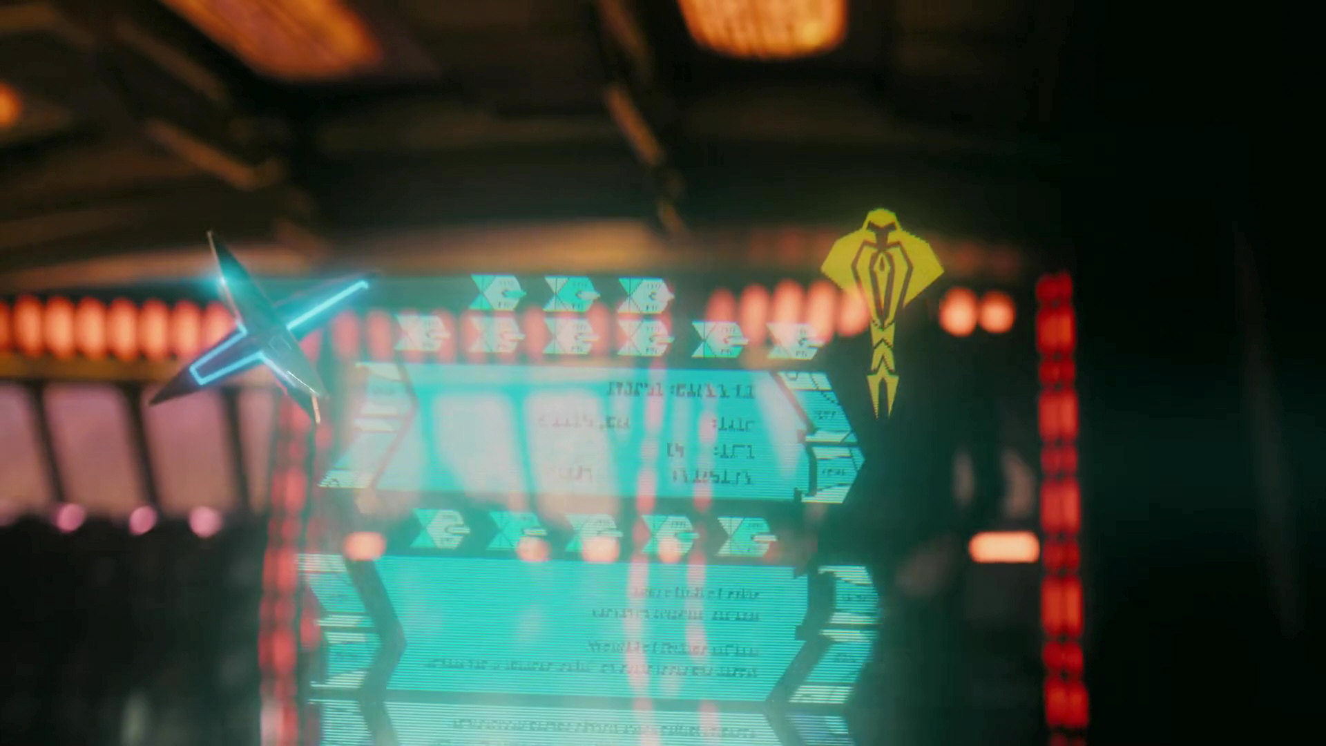 The emblem is clearly visible in a flashback in Quark's bar on Terok Nor in 2365 (DS9: "Necessary Evil"). It was re-used on two occasions, namely in DS9: "Second Skin" where we can make out the lower part on the Defiant's viewscreen. Furthermore two large backlit wall emblems adorn the Cardassian control center in DS9: "Defiant".