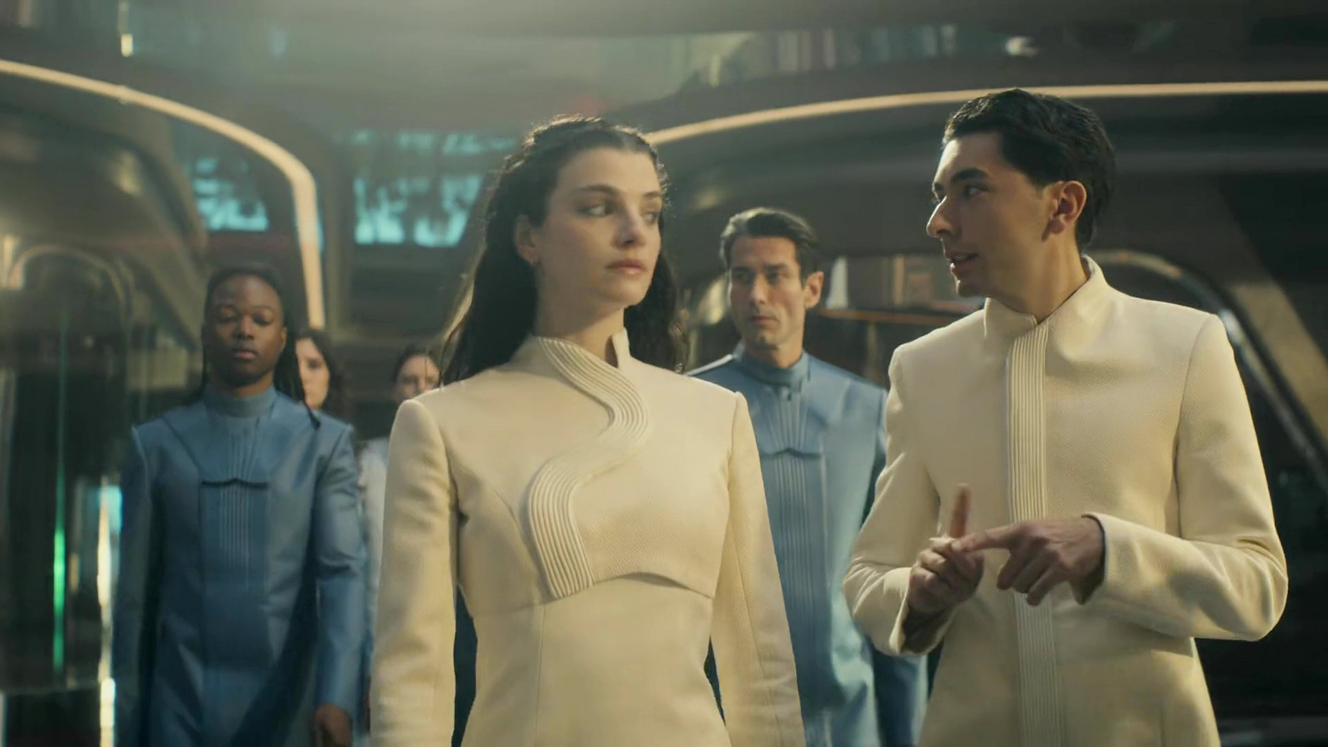 - Betazoids are telepaths in classic Trek. Lwaxana and Deanna Troi communicate telepathically when they are alone, although the latter is half-Betazoid and is only considered empathic. A couple of episodes such as TNG: "Tin Man", TNG: "Dark Page" or VOY: "Meld" establish that Betazoids are generally telepathic, albeit to different degrees. This is not the case with the Starfleet Academy Betazoids. In SFA: "Beta Test", President Emerin Sadal is played by Anthony Natale, who is deaf. He holds his speeches with sign language and an interpreter drone. When he speaks to his children and the latter among one another, they use sign language as well. It is obvious that this happens for a real-world reason, for the sake of inclusion. In-universe, it doesn't make sense. Firstly, it is the 32nd century, and no one has to be deaf. Secondly, even if Emerin Sadal is deaf and prefers to remain deaf, why wouldn't he and his kids communicate telepathically, unless he lacked that unrelated ability as well? We may make up reasons why they may have agreed on not using telepathy in the presence of others. But this explanation falls apart considering that Betazed has been isolated for over 100 years. Overall, it looks like the people in charge of SFA effectively forgot that Betazoids are telepaths (just like they forgot their black irises) and assumed they were only empathic, like Deanna Troi or like Tarima Sadal. At least, the latter has not shown her true powers yet, which are being suppressed by a neural inhibitor.