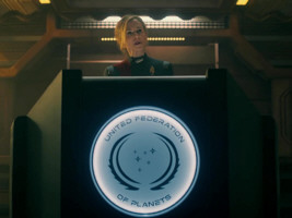 The hybrid emblem, however, is not consistently used in the Discoverse. DIS: "Will You Take My Hand?" shows a different emblem, without the SFTM reference. The olive branches are similar to those of the emblem that appeared in ENT: "These Are The Voyages". The blue map, on the other hand, was reduced to just the three central stars and a coordinate grid. Also note the lettering "FPU" for "Fédération des planètes unies" on the wall emblem.