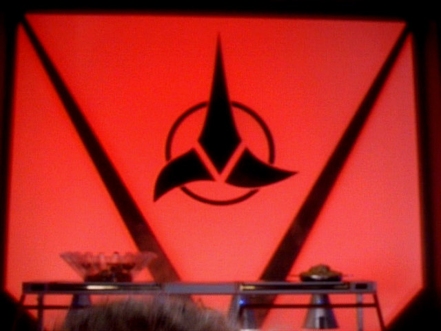 Furthermore, the colorful emblem appears on a banner in DS9: "You Are Cordially Invited" and on a display in "Tears of the Prophets". But on these two occasions, the colors blue and green are switched. The left spike that points down (on all other emblems ever seen) is green instead of blue, the right one is blue now. We can tell for sure that we see the reverse of the banner (so the left, downward spike is on the right) because the Klingon writing is the wrong way round. The color choice is most likely an error of the Art Department but is not negligible because we can see it twice (three times if we count in the upside-down version from TAS: "The Time Trap").