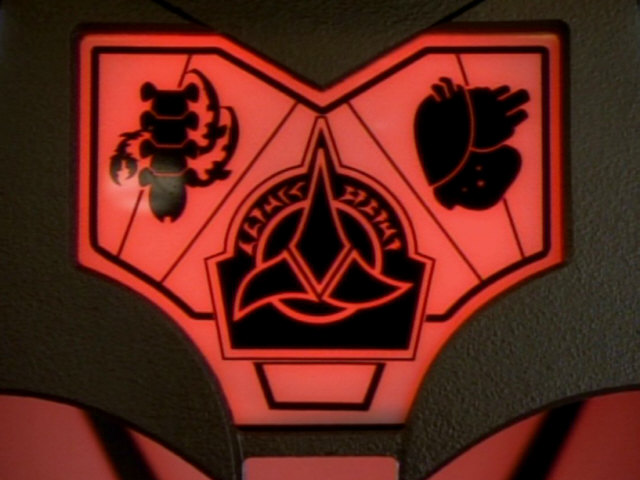 The same logo with a "3D effect" can be seen on a Klingon bridge in DS9: "Dramatis Personae", on a decorative console or wall panel on a Klingon BoP in DS9: "Soldiers of the Empire" and once more on Deep Space 9 in DS9: "Once More Unto the Breach". A similar logo appears on the very playful "jukebox" computer interface in ENT: "Broken Bow".