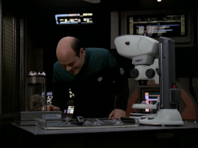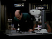 "Modern Props designed and fabricated futuristic medical / lab microscope mounted on a swivel stand has a white flourescent ring (blue when radiating). The test tube case attached to the unit has pop-up tubes." |