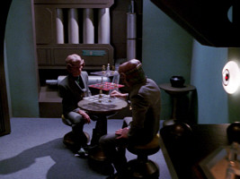The transparent elements in the ceiling of Klaa's bridge and in the wall of the transporter room in "Star Trek V" can also be seen in the interrogation room of the Enterprise-D.