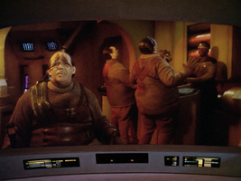 This set can be seen twice. It is possible that parts of the above big hall were re-used, a set that existed two seasons earlier. The first time is in DS9: "Apocalypse Rising" where the hall is supposedly aboard the Ty'Gokor station. Note that curiously the Klingon emblem is backwards on the screen cap. For some reason this one shot was reversed. The second time a few episodes later in DS9: "Looking for par'Mach in all the Wrong Places" essentially the same set represents a hall in the legendary city of Qam-Chee, reconstructed in a holosuite. The pillars and wall elements remained the same, only the warrior statues were removed and the face side was modified.