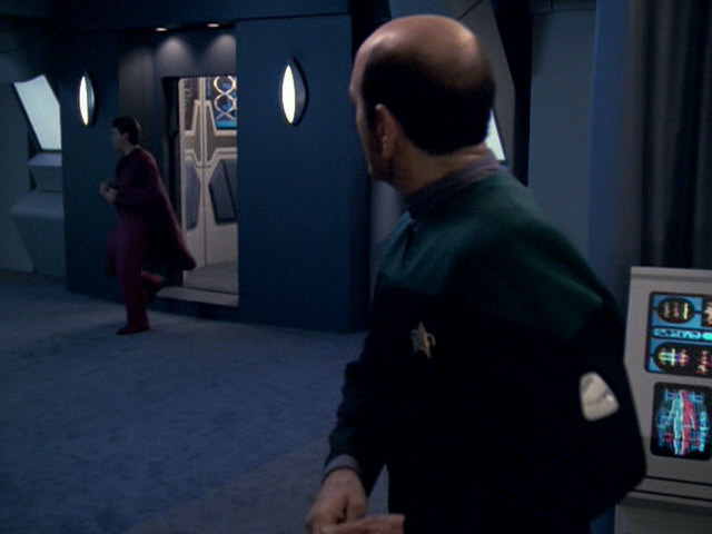 The extremely odd chair in Worf's quarters by the entrance previously appeared on the Tarellian plague ship in TNG: "Haven" where it really serves as a (command) chair. In the real world, the chair was designed by Peter Opsvik in the 1980s with the goal "to demolish the stereotypical ideal of the proper sitting posture". The same chair also appeared in the "Friends" episode "The One That Could Have Been" (set in an alternate timeline).