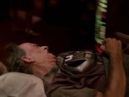 The prop shown as Kivas Fajo's forcefield generator in TNG: "The Most Toys" has gone through quite a remarkable development. It was used as a medical instrument in a couple of later TNG episodes, each time in a slightly different role. Dr. Crusher used it to heal a torn ligament in TNG: "Conundrum". In TNG: "Starship Mine", she treated Picard's "nasty little cut" with it, but the patient didn't keep still. The treatment of Guinan with the device in TNG: "Suspicions" was most likely simulated, as was Guinan's tennis elbow in the first place. But regarding its previous appearances as a medical instrument it seemed like the right choice if it had been for real. In TNG: "Emergence", Beverly treated Deanna's small wound with the device. Only in TNG: "Ethics" the prop was used for a considerably different yet still medical purpose, to monitor a patient's condition.