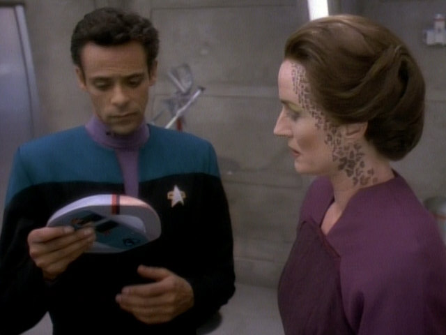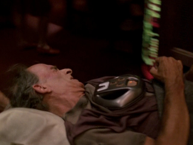 The headset also shows up in TNG: "Homeward", here obviously as a surgical instrument that transforms Worf's forehead into something Boraalan-looking. Finally we can see the prop in DS9: "Extreme Measures" as an engrammatic sensor. The prop was slightly modified for this purpose. New blinking add-ons were affixed to the two segments on either side of the central piece. The whole setup along with the computer is called a "multitronic engrammatic interpreter", while the scripts calls our prop just the "headset".