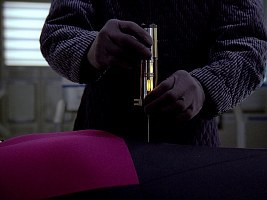 In DS9: "Inter Arma Enim Silent Leges" we can see the prop again. This time it is supposed to be a Romulan mind probe, used to access Dr. Bashir's memory. Actually, we learn about its name as late as in DS9: "Extreme Measures" where Dr. Bashir makes use of exactly such a device to enter Sloan's mind. The naming is anything but consistent here, the three variants are "Romulan memory scanner", "Romulan mind probe" and finally "Romulan mental probe". The only difference between these two episodes is that in "Inter Arma Enim Silent Leges" the light is blue, whereas it is red in "Extreme Measures". Interestingly, the device shows up between these two episodes too when the injured General Martok is treated in DS9: "Tacking into the Wind". We certainly wouldn't expect that brain spying is a standard treatment by Federation physicians. ;-) And just for a change, the LED in the device is yellow here.