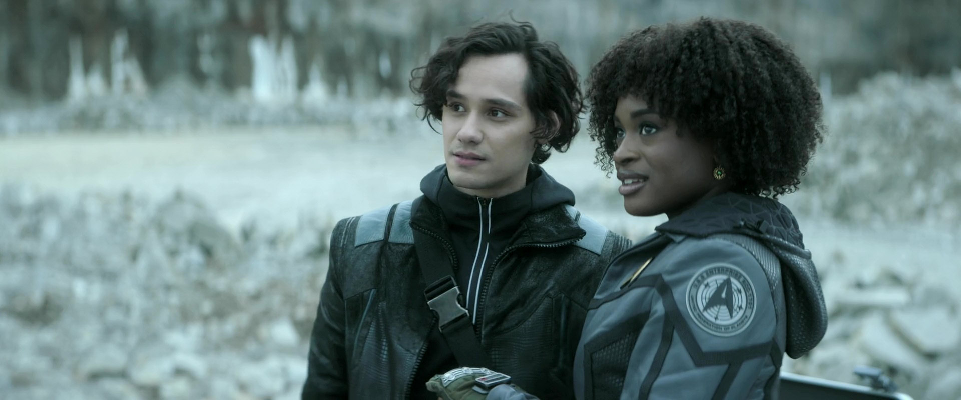 The Starfleet Command seal shows up in many different places in Strange New Worlds. It is monochrome when it appears on monitors and as decoration, whereas it is colored on the official flag and in official documents. All variations have in common that the signature separation line in the arrowhead from Discovery and even Picard is gone. This is in line with the other appearances of Starfleet arrowheads in Strange New Worlds, like notably the Enterprise crew badges that don't have a vertical fold.
