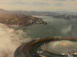 "Such Sweet Sorrow II" shows a view of the Golden Gate Bridge (with very odd solar panels) from San Francisco towards Marin County. We can see several buildings in the hills. The area of Horseshoe Bay is a bit reminiscent of Star Trek Enterprise. The room where Tyler is debriefed is probably located in one of the buildings of the Horseshoe Bay site. We can see a cityscape (and not hills with buildings on the top) on the opposite side of the bridge.