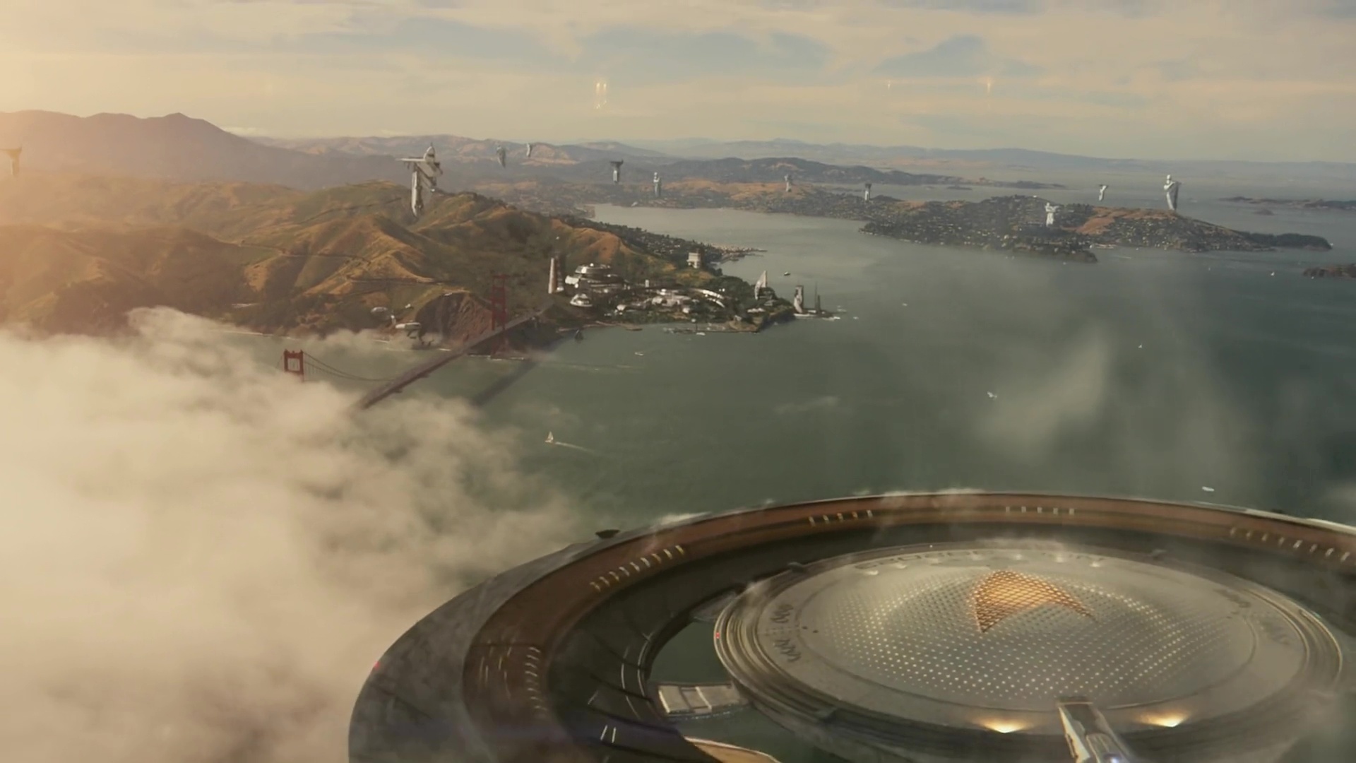 In "Star Trek Into Darkness" we can see a building identified as "Starfleet Headquarters". It is several kilometers away from the Golden Gate Bridge. The shot of the bridge must have been taken from some point northeast of the city center. Another Starfleet building located on the shore of San Francisco Bay looks like it is much closer to the bridge.