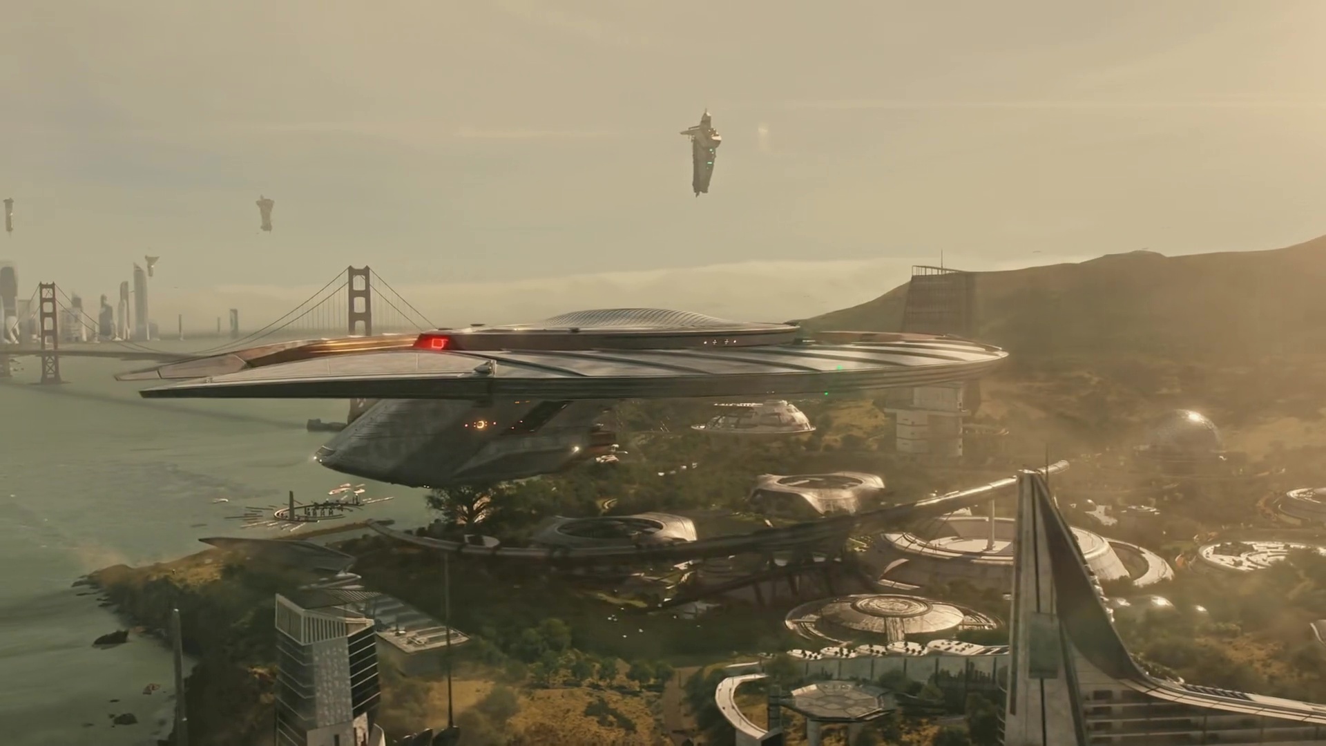 In DIS: "People of Earth", set in the year 3189, the northern shore of San Francisco Bay still looks similar as it did in Discovery's 23rd century and as in Picard, although Starfleet Command and Starfleet Academy are no longer located here. There are overall fewer buildings, and additional structures floating in the sky. Curiously, the solar panels on the Golden Gate Bridge are still present.