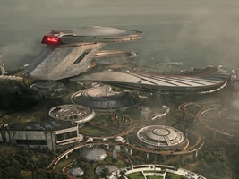 In the fascistic alternate version of Earth created by Q in PIC: "Penance", much of San Francisco (which is apparently the capital of the evil "Confederation") looks like it does in the same year 2401 in the original timeline. Even the solar panels are the same (which are a hallmark of modern Trek by now). A statue of Adam Soong was inserted into the familiar scenery of Horseshoe Bay. The real-life Walt Disney Concert Hall, which served as the assembly hall of Starfleet Academy in "The Star Gazer", is now the "President's Palace", with an according new emblem on the outside.