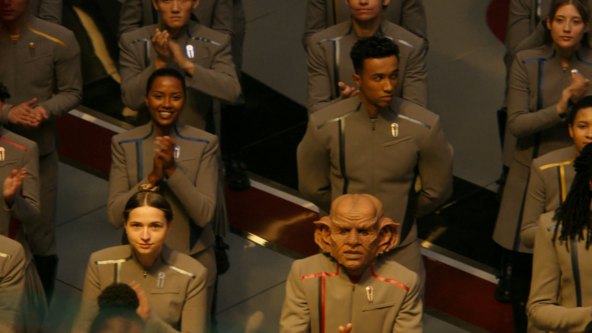 The redesign of some established alien species continues in Discovery's fourth season, in Strange New Worlds and in Starfleet Academy. We may argue that the redesigned Ferengi, who can be seen in DIS: "Anomaly" as a Starfleet officer, has a multispecies heritage much like President Rillak. But "...But to Connect" shows a non-Starfleet Ferengi with the same new make-up and "Jinaal" yet another one, the bartender on the Discovery. The new make-up also appears on Starfleet Academy. So it is safe to say that this is how all Ferengi are supposed to look now.