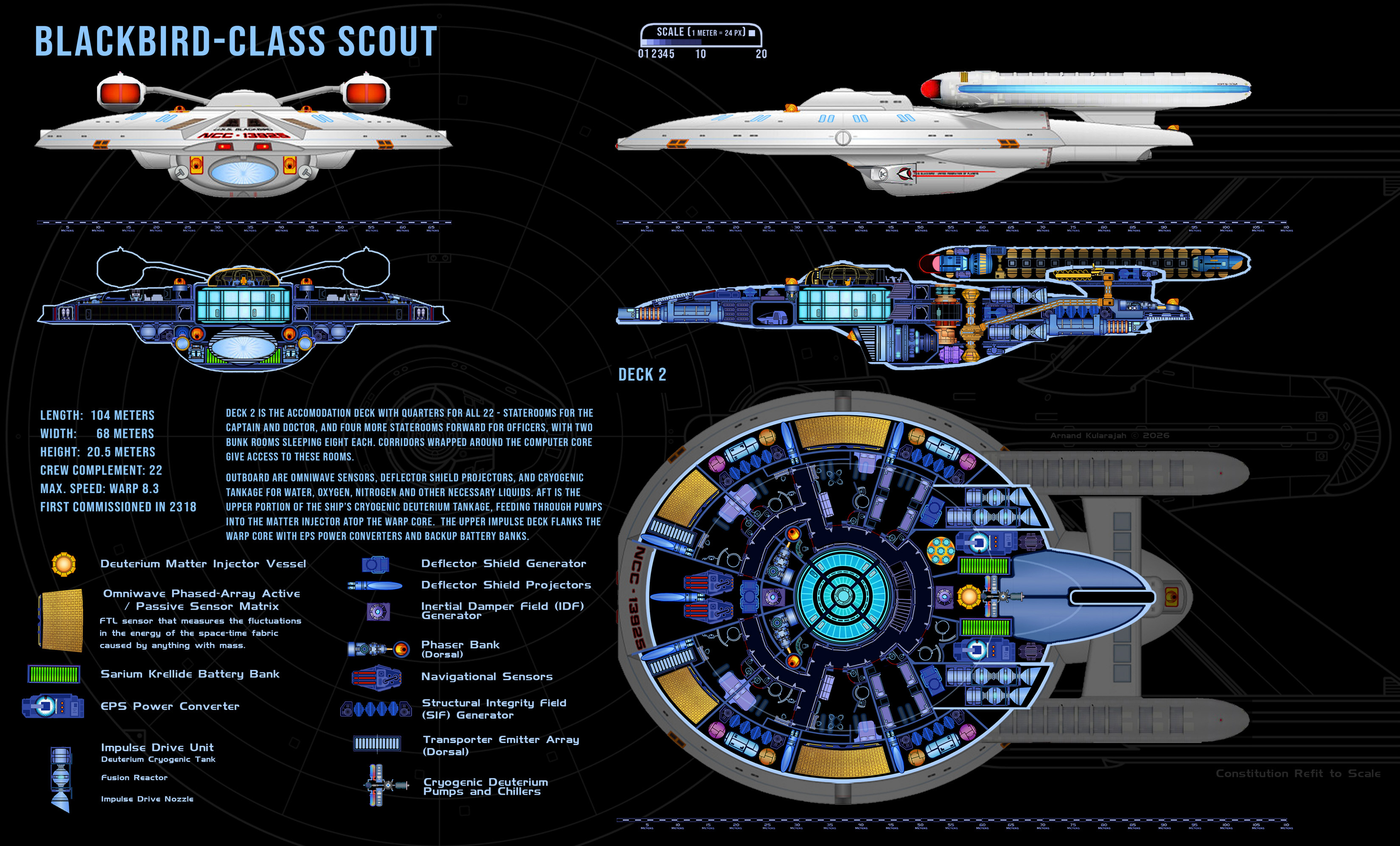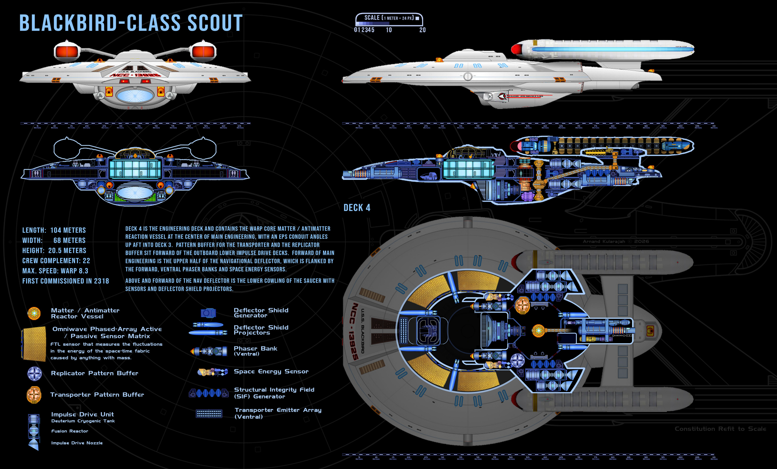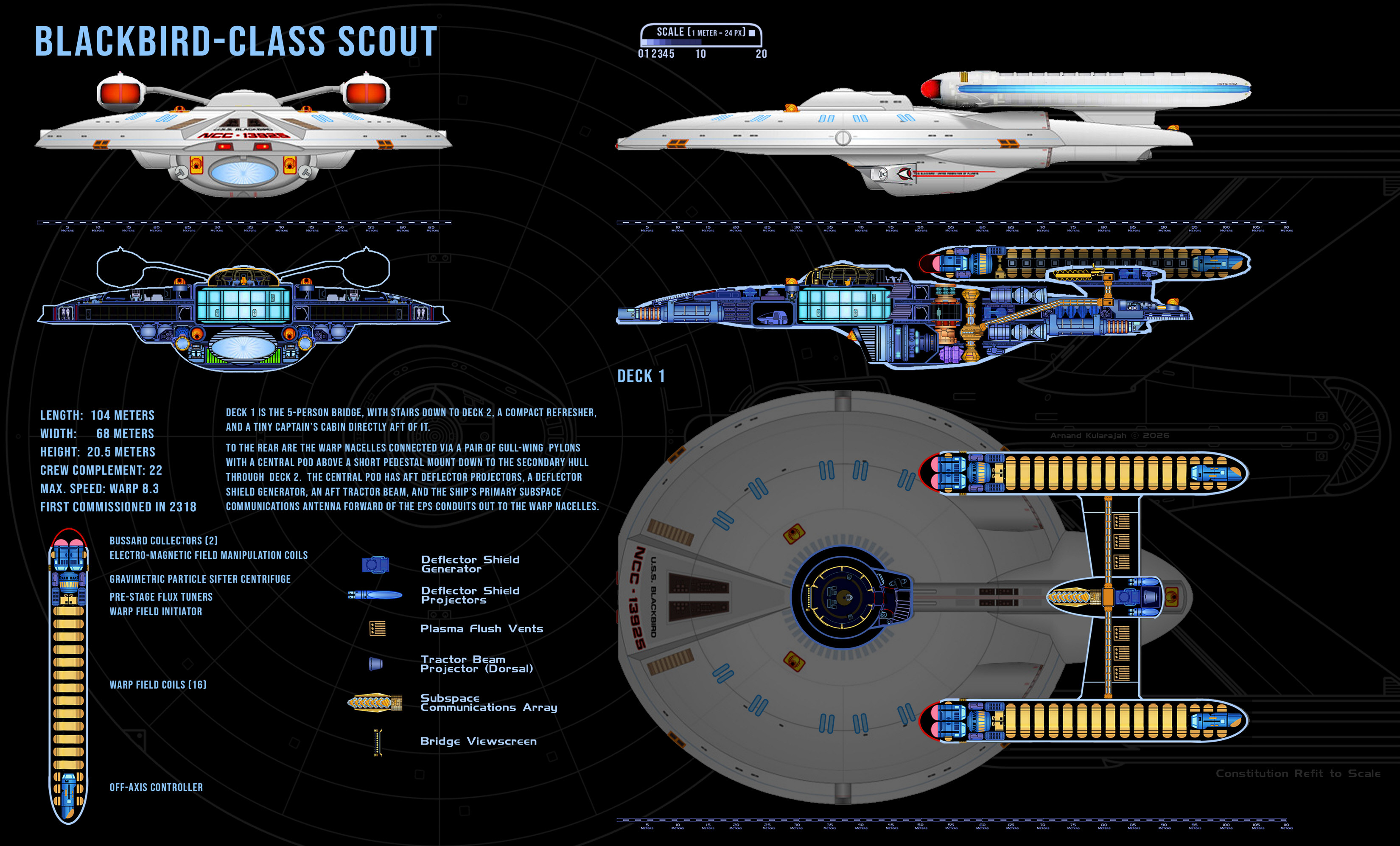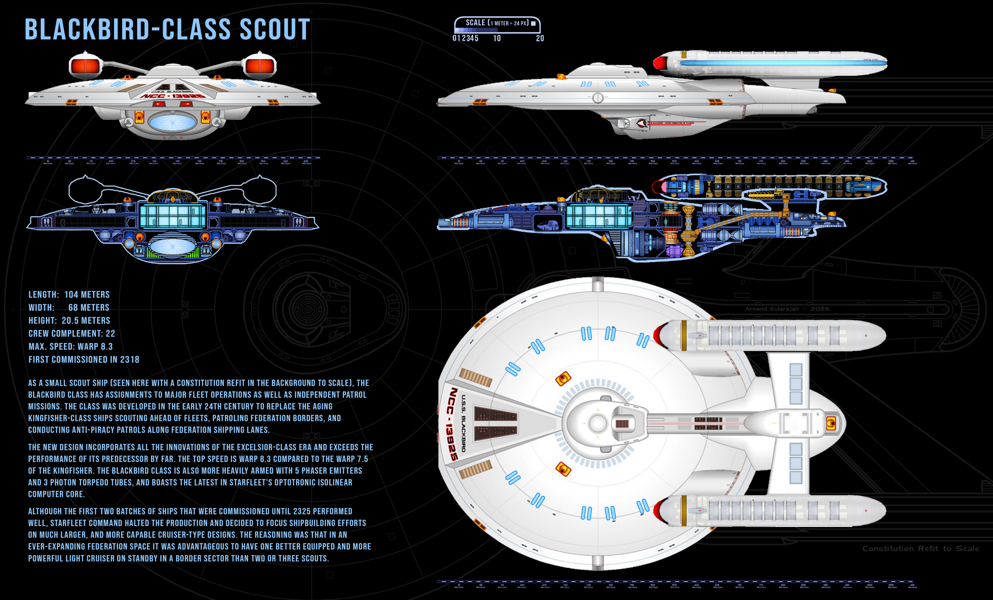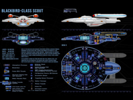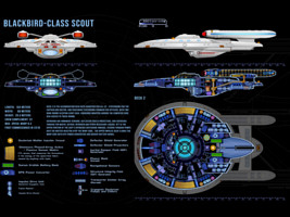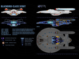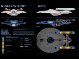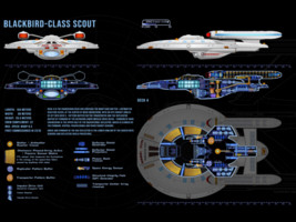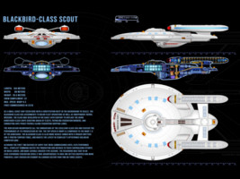 As a scout ship, the Blackbird class has assignments within major fleet operations as well as independent missions. The class was developed in the early 24th century to replace the aging Kingfisher-class ships. The new design incorporates all the innovations of the Ambassador-class era and exceeds the performance of its predecessor by far. The top speed is Warp 8.3 compared to the Warp 7.5 of the Kingfisher. The Blackbird class is also more heavily armed with 5 phaser emitters and 3 photon torpedo tubes. Although the first two batches of ships that were commissioned until 2325 performed well, Starfleet Command halted the production and decided to focus shipbuilding efforts on much larger cruiser-type designs. The reasoning was that in an ever-expanding Federation space it was advantageous to have one better equipped and more powerful light cruiser on standby in a border sector than two or three scouts.