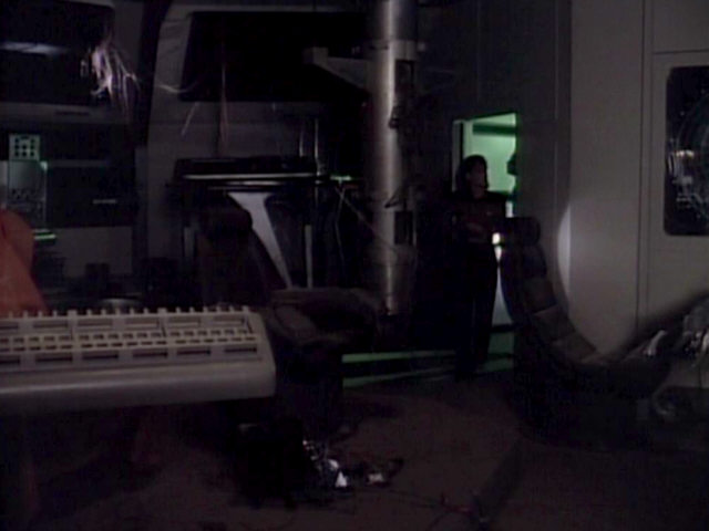 | The prop to the right of Geordi (two hollow tubes) often appears when generic debris is needed for a scene. It is also seen in "The Vengeance Factor" amongst other episodes. | ![]() "The Vengeance Factor" |